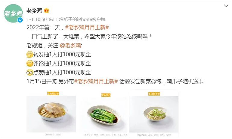2022年终于到来,新年之时各品牌也开始摩拳擦掌了。比如餐饮品牌老乡鸡,在新年第一天就推出了许多菜式新品,为顾客的胃口带来新鲜感,对于粉丝的奖励也显得有些豪横,转发、评论、点赞中会各抽1人打1000元现金。月初推新品,其实是老乡鸡「月月上新」活动的惯例,运用产品上新和粉丝互动维持了品牌的活跃度。作为一个品牌,老乡鸡在近几年已经成为了现象级的案例,这和品牌的来路不无关系。01