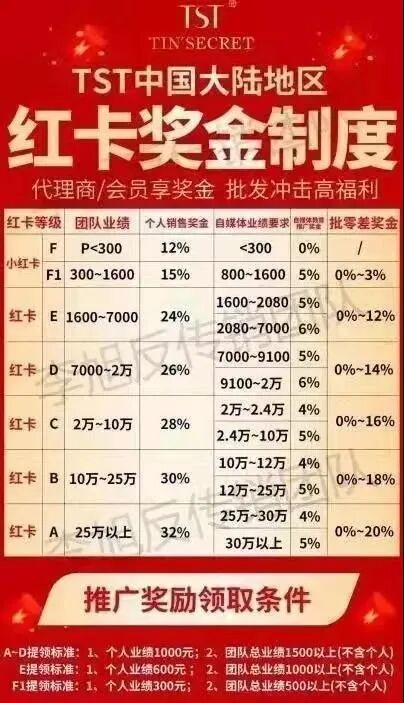 此外,别忘了张庭、林瑞阳本身也是明星。作为一直被称为“冻龄女神”的张庭,显年轻的外形似乎也成为了产品使用效果的最佳例证,直接真实地助推了TST微商帝国的不断壮大。据了解,目前TST一共有1200万个代理,每年的销售额或超过100亿元。仅在2018年,张庭、林瑞阳实控的上海达尔威贸易有限公司纳税就高达21亿元,是青浦区纳税企业的第一名,超过了圆通、申通和上海家化。当然,拥有1200万个代理,除了“万众瞩目”的明星光环外,也离不开微商专属的商业模式。TST采用的金字塔销售等级商业模式,是微商最常用的。在这种模式中,级别越高,就能拿到更多折扣产品。