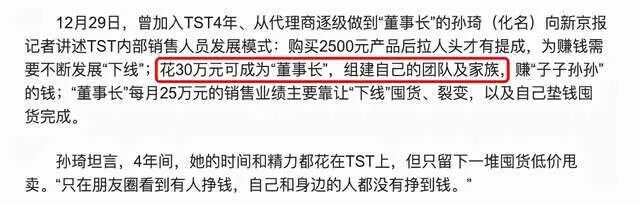 值得注意的是,TST不仅品牌形象因明星效应具有诱惑性,代理模式也挺具有蛊惑性的。据此前的代理透露,一个人只要能够找到100个代理,且每个月的业绩超过10万,就能成为“董事长”。另外,做到了董事长就可以在现场见到张庭本人。