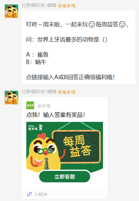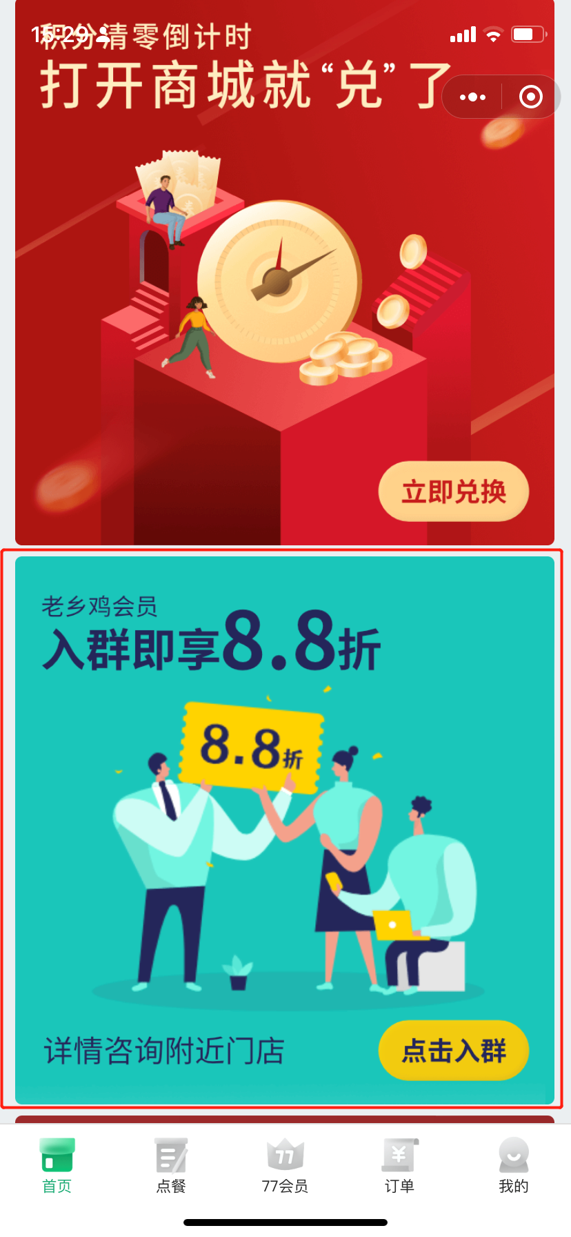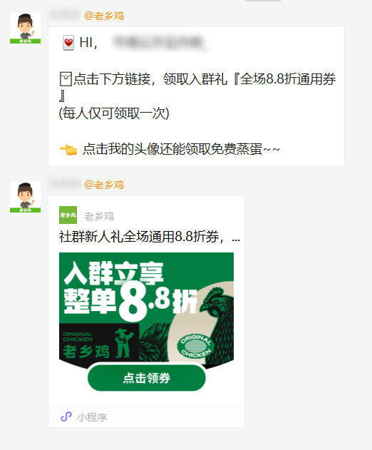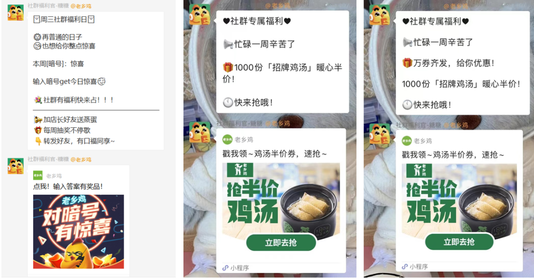 为了降低用户的决策门槛,老乡鸡主要通过社群里发放优惠券和小程序中的“ 77 会员卡”,来提升转化率和复购率。运营社注意到,老乡鸡社群存在一个现象,就是用户们很少在群里进行讨论。这对于餐饮业社群而言,其实是正常情况。毕竟餐饮社群和其他社群(例如美妆社群)不同,用户没有太多讨论需求,只要能解决吃饭这个刚需就足够了。大家买化妆品前会做很多功课,向客服询问好不好用、适不适合自己;但吃一顿(人均 20 元、低客单价的)快餐前,就不会考虑这么多问题。很显然,老乡鸡的社群就属于以销售为导向的社群,发言多不一定代表真正的“活跃”,用户最终是否会去下单消费才是最重要的。用户其实最在意的还是能否以更优惠的价格吃到饭菜,因此社群里经常会发放各种优惠通知:每位用户在进入一家门店的社群之后,店长会赠送“新人入群福利”:一张 8.8 折的优惠券,以及一份免费蒸蛋,在下次点单时可以抵用。每到周三“社群福利日”时,社群福利管会发起“对暗号”活动:用户输入“暗号”,就可以得到一张满减代金券。除此之外,每隔几天,社群福利官还会发放“专属福利”,譬如抢晚餐整单半价券、抢鸡汤半价券等等。“虽然我们社群里讨论不多,但是活动参与量非常的高。”知情人士向运营社透露,“靠着这些优惠活动,转化率提升了 20% - 30% 。”不过,老乡鸡也开始针对“社群里讨论氛围不浓厚”这一现象做出了一些改进,在社群里增加了“每周益答”环节,来调动用户的发言积极性。另外,知情人士也表示,由于每家门店都设有一个社群,老乡鸡还会针对不同的门店场景,在社群里做不同的运营动作。譬如,门店开在写字楼里,平时周末就不会在它的社群里发消息,因为社群里的用户多是上班族,周末时大家都不上班,用户没有消费需求,就算发得再多也没有意义,反而会造成打扰;但如果门店是开在商场里,周末或节假日时则会在社群里多发一些优惠信息,因为放假期间用户多会选择去商场逛街,此时可以吸引他们前去吃饭消费。对不同的社群针对性地做好运营策略,既可以不打扰到用户,又可以充分发挥社群的价值。2) 靠 “ 77 会员卡”,复购率提升 1 倍多
