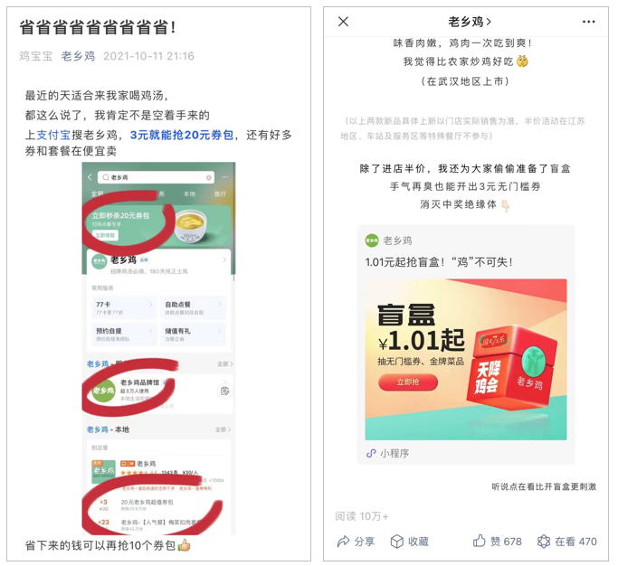 运营社注意到,和很多餐饮店不同的是,老乡鸡在线下门店的餐桌上没有贴码,用户不需要扫码进入小程序也能直接点餐结账。现在一部分餐饮店的引流策略带有些「强制性」,譬如,用户只能通过扫码关注公众号、进入小程序才能下单;甚至还有店家要求一定要扫码进入社群才能下单。这样的方式虽然确实可以起到引流作用,但却容易引起用户的反感,最终引来的也大都是“僵尸粉”——不会成为“回头客”,甚至还会把店家取关拉黑。第一种,用“评价领券”将线下的顾客流量引导到线上。在线下门店,用户不必通过扫码才能点单,但是用微信支付结完餐费后,会弹出“评价领老乡鸡 3 元券”的提示,引导用户进入小程序进行评价。这样虽然不能百分百保证线下顾客会被引流至小程序,但是可以很大程度地降低用户的反感。第二种,在公域平台吸粉,让用户“自发搜索”老乡鸡。自 2020 年 2 月老乡鸡因为“老板手撕员工联名信”和“ 200 元办土味战略发布会”火了之后,近一两年来老乡鸡在公域平台的动作也是接连不断。