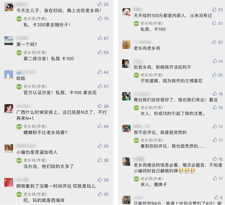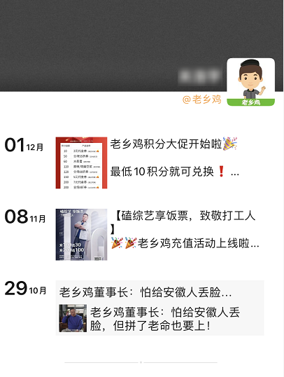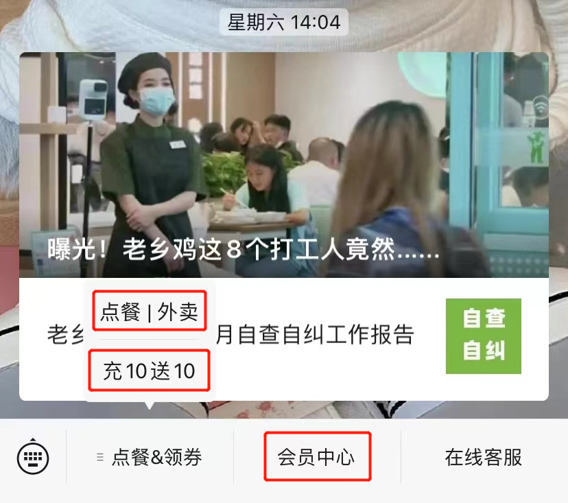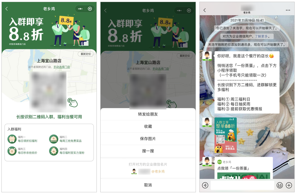 “在网上火了之后,有很多人认识了老乡鸡,会来主动搜索公众号,吸引了不少前来吃瓜的路人粉。”有一位知情人士向运营社透露,“目前老乡鸡公众号一天新增的粉丝有几千人,总粉丝量有大几百万。”在老乡鸡公众号的菜单栏里,接入了多个通往小程序的入口。比如,用户点击“点餐/外卖”,会跳转至小程序的点餐页面;点击“充 10 送 10 ”,会跳转至小程序的钱包页面;点击“会员中心”,则会跳转至小程序主页。老乡鸡还会推出一些节日活动,例如冬至鸡汤节等等。通过在公众号文章里内嵌小程序,再用“半价抢购中份鸡汤”这样的福利关键词来吸引用户点击。用户进入小程序后,在首页会看到“入群即享 8.8 折”的优惠提示。给出这个提示,是将小程序流量沉淀至企业微信的关键动作。用户点击进入后,系统会自动匹配到离用户最近的一家门店,提示用户扫码。扫描二维码后,用户需要先添加门店店长的企业微信。企业微信自动通过好友请求后,会给用户发送一张带有社群二维码的海报。通过扫码,用户最终进入了该门店的社群。在添加了老门店店长的企业微信后,运营社发现了一个“特别之处”:很多品牌做私域时会选择在朋友圈定时定量发推广内容,但老乡鸡门店店长的企微几乎不更新朋友圈,整个朋友圈里总共就可见三条内容。老乡鸡这么做,或许是出于“减少对用户打扰”的考虑。如果用户老是看到 TA 不感兴趣的朋友圈内容,反而容易会把工作人员的企微删掉。那么不依靠朋友圈,老乡鸡是怎么做用户留存的呢?运营社发现,老乡鸡在公众号和服务号上下了很多功夫。老乡鸡的公众号是服务号,虽然一个月只能推送 4 次,但是相比订阅号有一个明显的优势:服务号推送的消息不会被折叠,能够直接显示在用户的聊天列表里,因此曝光率和打开率更高。并且,推送消息越多,不代表效果就越好。如果用户总是频繁地接收到来自商家的营销消息,反而容易取关公众号。“有用”才是服务号内容的核心。第一,给服务号小编树立“宠粉”、“接地气”的人设。老乡鸡服务号小编常常以“我今天为大家准备了xxx”的第一人称,来教粉丝怎么领取福利、薅羊毛。并且,服务号小编会对许多用户的留言进行回复,和读者互抛段子。说话不打官腔、风趣幽默、还喜欢和粉丝互动,这样的“人设”能让老乡鸡迅速拉近和用户的距离。用户感受到屏幕对面是一个活生生的人,而不只是个没有感情的“推送机器”。从其他公域平台吸引了很多路人粉后,老乡鸡再通过这样的互动把他们留下。第二,服务号里有一个特色栏目是“每月自查自纠”。老乡鸡每个月会主动召集一批顾客去检查餐厅的卫生、产品和服务,并且在推文中报备顾客反馈的餐厅管理问题、相应的整改措施以及整改过后的现状。