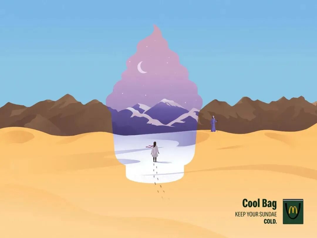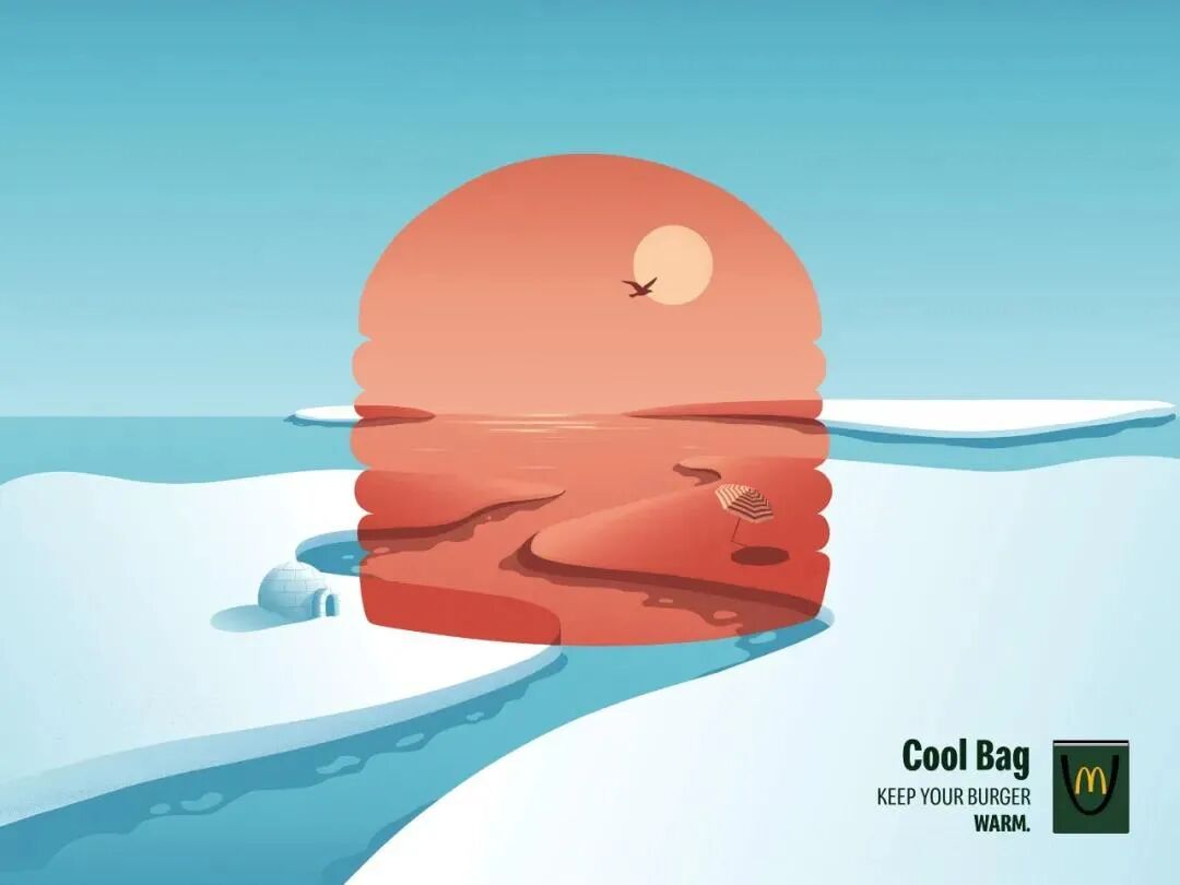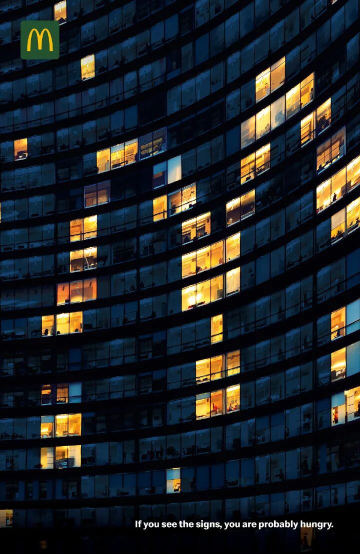 if you see the signs you are probably hungry如果用一个词来形容麦当劳的平面海报,“四两拨千斤”再合适不过。麦当劳往往用最少的笔墨就能传达最丰富的视觉锤意象,将Less is more理念诠释得淋漓尽致。极其简约的海报画面,配合着恰到好处的文案,如钩子一般,牢牢抓住行人的目光,让人过目不忘。这就是“被汉堡耽误的设计公司”麦当劳的强大实力。即便没有标记品牌logo,没有露出任何产品信息,麦当劳也总能让消费者一眼辨识出来,收获会心一笑的默契,并为麦当劳巧妙的创意脑洞所折服。正如艾·里斯 & 杰克·特劳特在《定位》中所说:“身处过度传播的社会,最好的应对方法是将信息极度简化”。在这个注意力稀释的碎片化时代,麦当劳却用创意之笔开创了独特的设计风格,给作品注入灵魂,尤其难能可贵。虽然麦当劳的成功难以复制,但这份对创意的匠心打磨精神,值得我们学习。