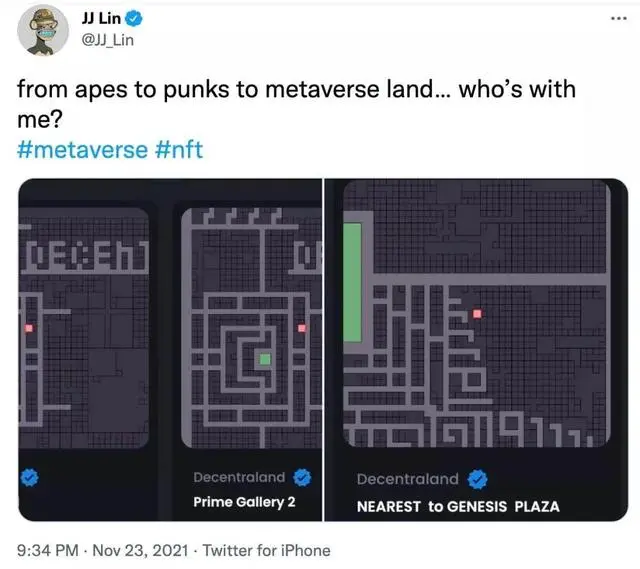 除了购买NFT头像之外,林俊杰则是盯上了元宇宙当中的虚拟土地。前段时间还在社交媒体上宣布自己购买了三块虚拟土地,有媒体估算林俊杰所购买的这三块土地花费超过12万美元。
