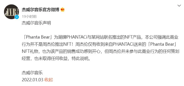 1月3日晚上,杰威尔音乐在微博上发表声明称幻象熊并不是周杰伦所推出的NFT项目,只是收到了礼物赠送,没有参与任何的相关商业行为。