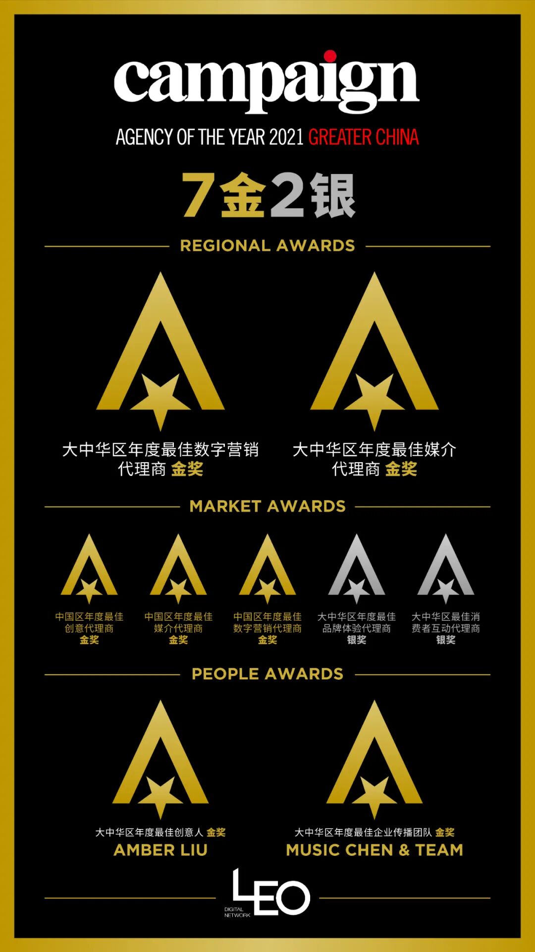 由《Campaign》主办的“年度最佳代理商大奖”(Agency of the Year, 简称AOY)获奖名单正式揭晓。利欧数字收获7金2银,成为AOY史上首家连续三年蝉联“大中华区年度最佳数字营销代理商”金奖和“中国区年度最佳数字营销代理商”金奖的中国本土代理商。今年,利欧还包揽了中国区创意、媒介、数字三大核心主类别的金奖,并首度将“大中华区年度最佳媒介代理商”金奖收入囊中,力证了整合与创新实力。此外,值得一提的是,利欧数字首席创意官刘阳(Amber Liu)获颁“大中华区年度最佳创意人”金奖,陈莺彧(Music Chen)带领的企业传播团队摘得“大中华区年度最佳企业传播团队”金奖。去年,利欧数字首席执行官郑晓东(Dalton Zheng)也收获了一枚“大中华区年度最佳企业领袖”金奖。上述奖项,皆是AOY首次颁予中国本土代理商的精英人才们。AOY致力于表彰全球具有创新力、优秀管理、出色业务表现及整体企业运营的代理商与个人,覆盖大中华区、澳新、日韩、东南亚、美国、欧洲、中东等区域。每年,AOY都会甄选数十位品牌高管组成评审团,评选结果由普华永道负责审计,客观公正且足具含金量。如今,产品、营销、媒介、渠道、消费者,全都在重新组合,甚至走向一体化。营销链路中的每个主体都在主动做营销,甚至承担起了最终的目的——完成销售。利欧数字CEO郑晓东说道:“感谢Campaign对于利欧全方位的肯定,感谢客户的认可及合作伙伴的支持,感谢每一位利欧人的付出。近年来,基于对市场快速而精准的捕捉,利欧在产业链上下游做了非常广泛的布局,实现了从品牌到销售端完整的营销链路布局,通过构建完整的端到端的营销服务,努力帮助客户实现传播和业绩的双赢。”在产业链前端,利欧将服务延伸至商业策略、产品设计包装等领域,打造了一套完整的新消费品牌孵化工具,助力新消费品牌从0到1,以及从1到10的不同阶段的发展进程。今年,利欧打造的创意作品,相继斩获了包括D&AD、LIA、CLIO、One Show、New York Festival、ADC Awards、Pentawards、AD STARS等多个国际顶级奖项。在产业链后端,利欧在短视频、直播电商和信息流领域持续发力,与巨量引擎、快手、腾讯广告、360、百度、OPPO、小米等头部媒体平台建立了深度的合作关系,排名不断攀升,整体合作规模已达百亿。利欧还在上海、重庆两地打造了3500平米的短视频基地,建立了超100个场景,全面推动网红、直播、短视频更体系化、高效性、集中式的运作与管理。未来,利欧将继续投入人力、财力、物力,将大数据、人工智能、区块链等新技术成果应用到数字营销的各个方面,并与政府机构、学术科研机构、行业领先公司等合作,探索开发数字营销的新场景、新应用,全方位助力投放效率、内容定制化和流量转化的发展需求,真正实现以营助销,在创意和生意两个维度帮助客户创造价值。