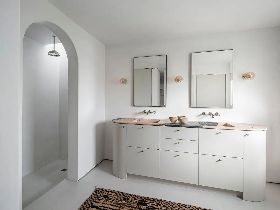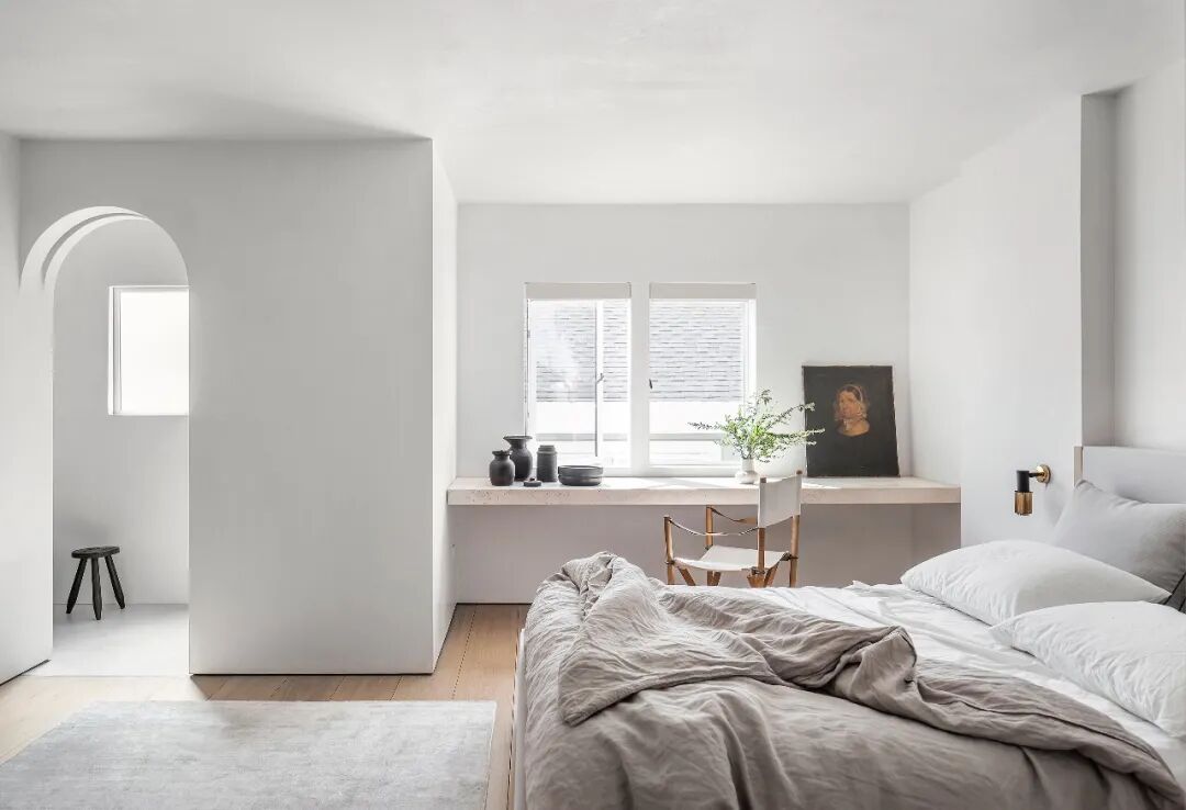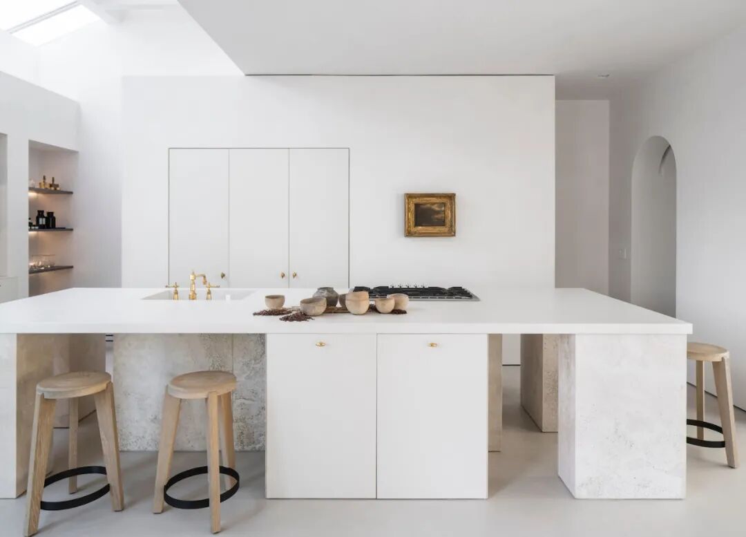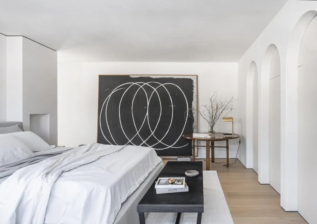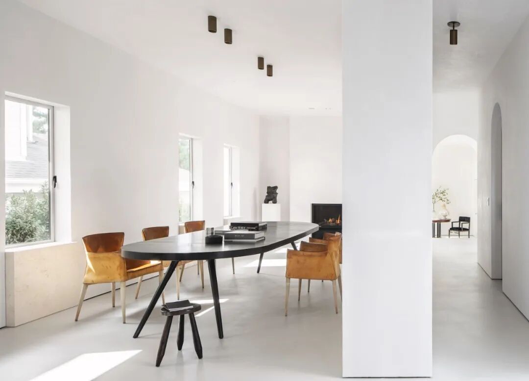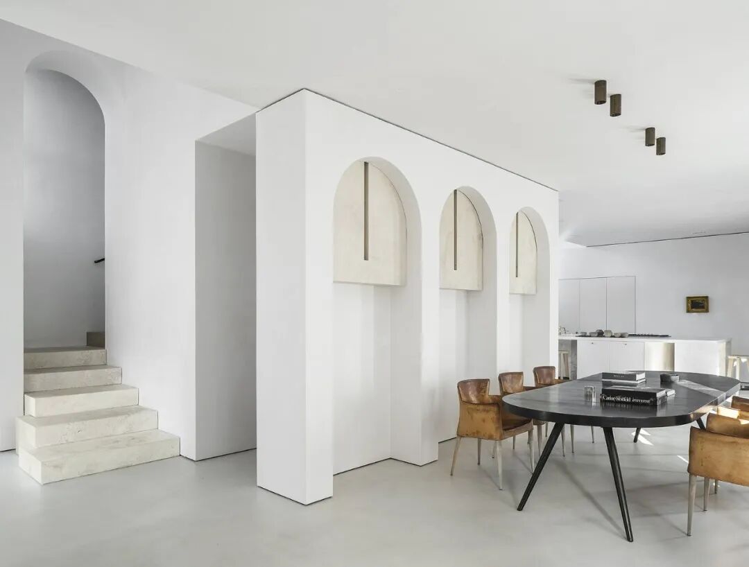这所房子最初没有拱门,在Mandy Graham的设计下,拱门几乎穿透了整个空间。它定义了餐厅和厨房的组合空间,由一个小走廊隔开。拱门元素的应用,是Mandy Graham的项目中最经典的特征之一,它常常被视为古典甚至哥特式建筑的元素,然而对于Mandy Graham来说,在建筑中使用拱门元素是向装饰艺术的致敬,是在简洁的线条和触感的细节中体现了一种潜在的精致感。她 将曾经漫长而平静的走廊重新想象成一系列宏伟的拱门,让光影的柔和相互作用成为空间中的艺术。