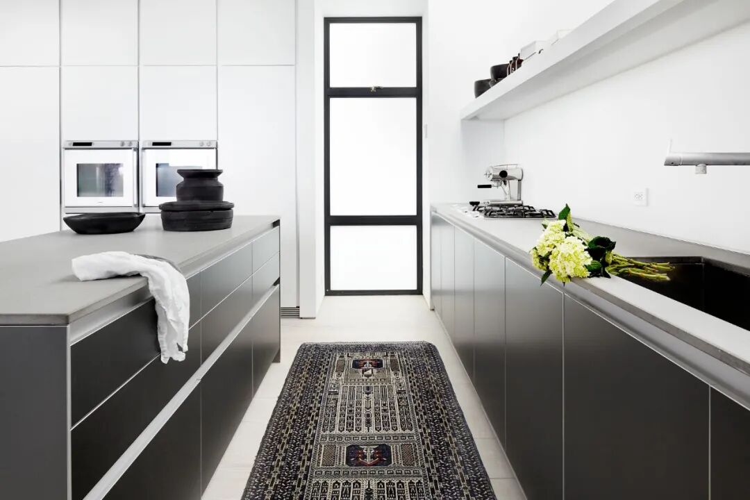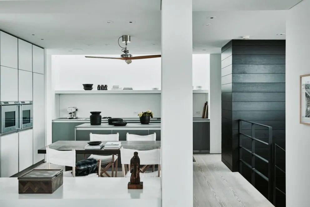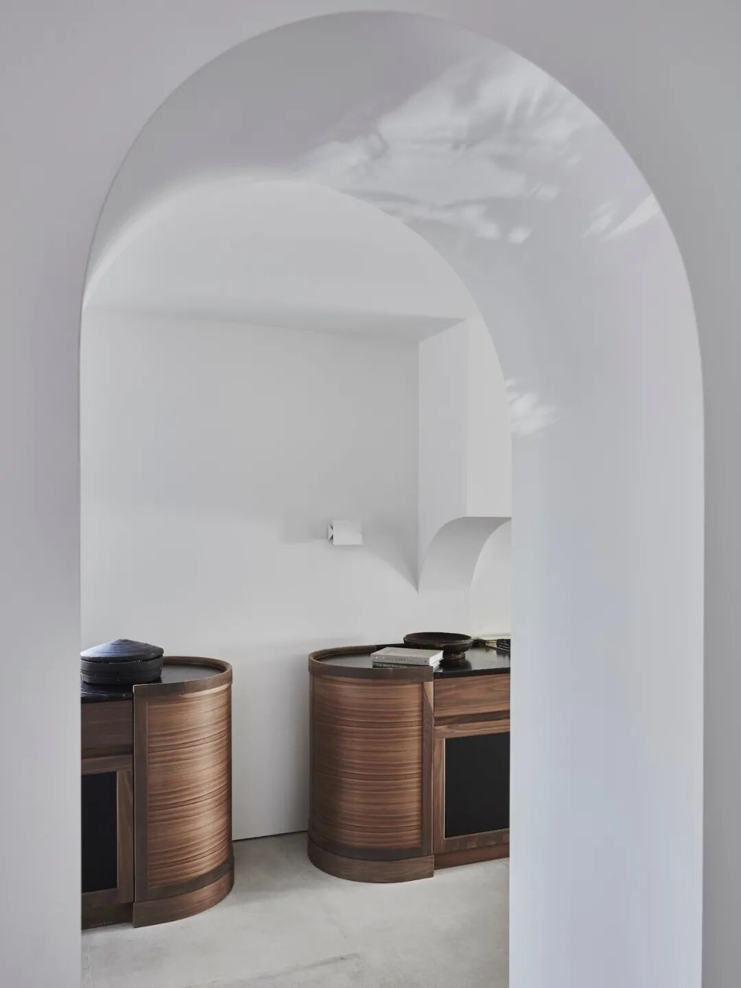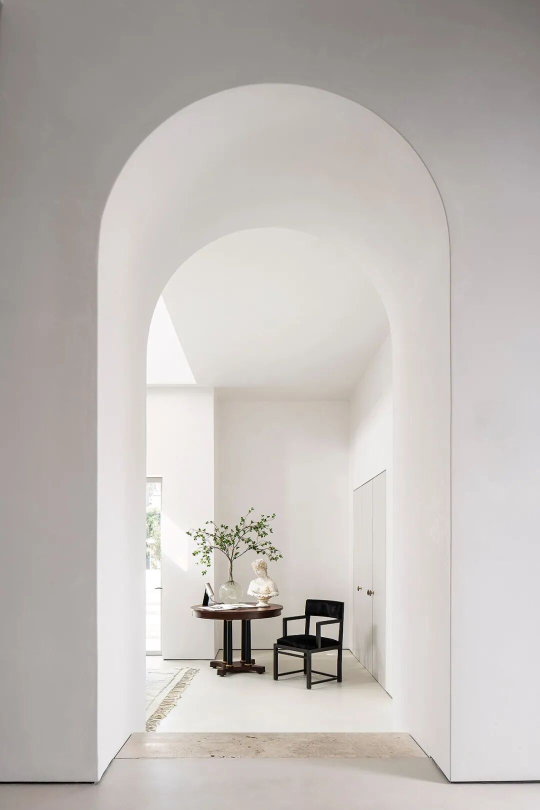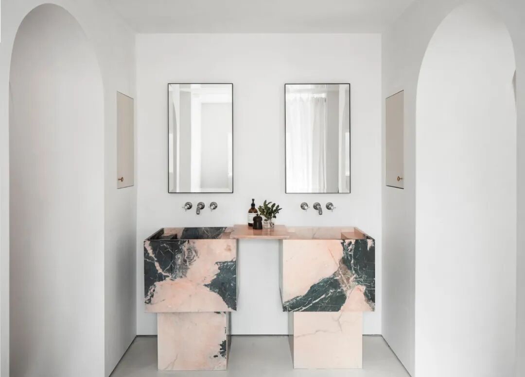 这所房子最初没有拱门,在Mandy Graham的设计下,拱门几乎穿透了整个空间。它定义了餐厅和厨房的组合空间,由一个小走廊隔开。拱门元素的应用,是Mandy Graham的项目中最经典的特征之一,它常常被视为古典甚至哥特式建筑的元素,然而对于Mandy Graham来说,在建筑中使用拱门元素是向装饰艺术的致敬,是在简洁的线条和触感的细节中体现了一种潜在的精致感。她 将曾经漫长而平静的走廊重新想象成一系列宏伟的拱门,让光影的柔和相互作用成为空间中的艺术。