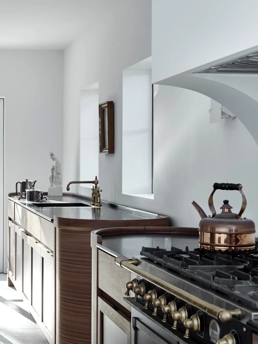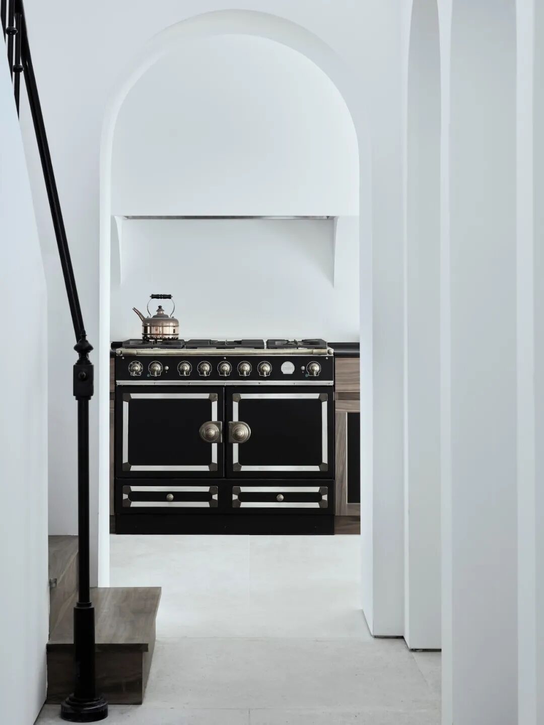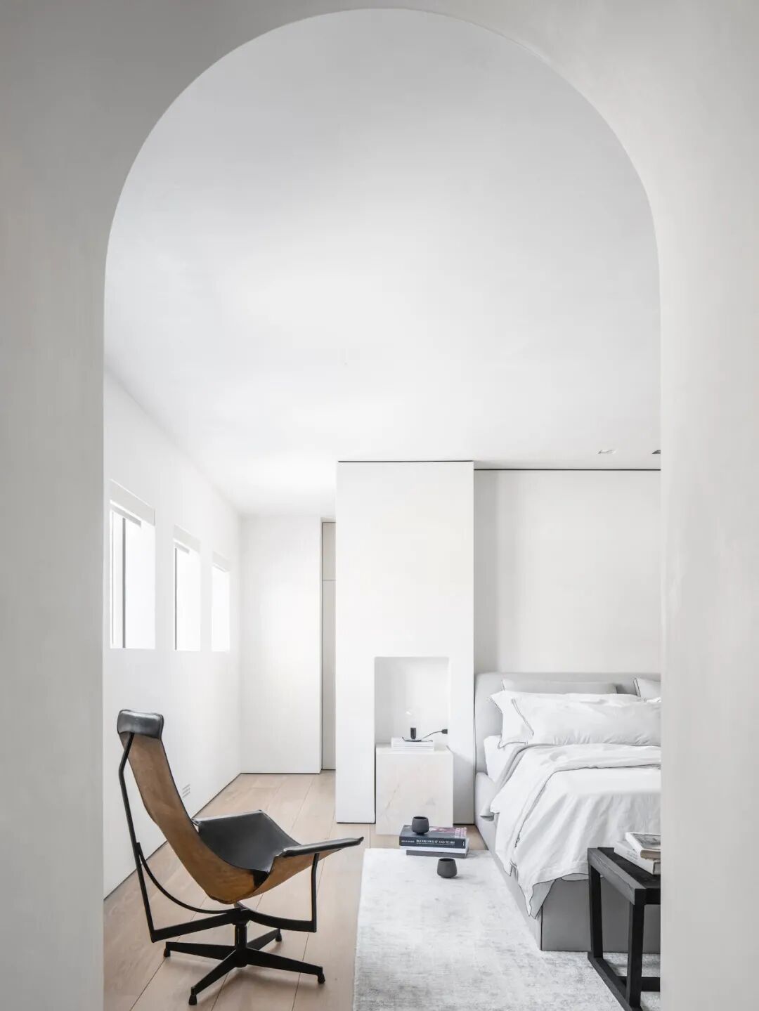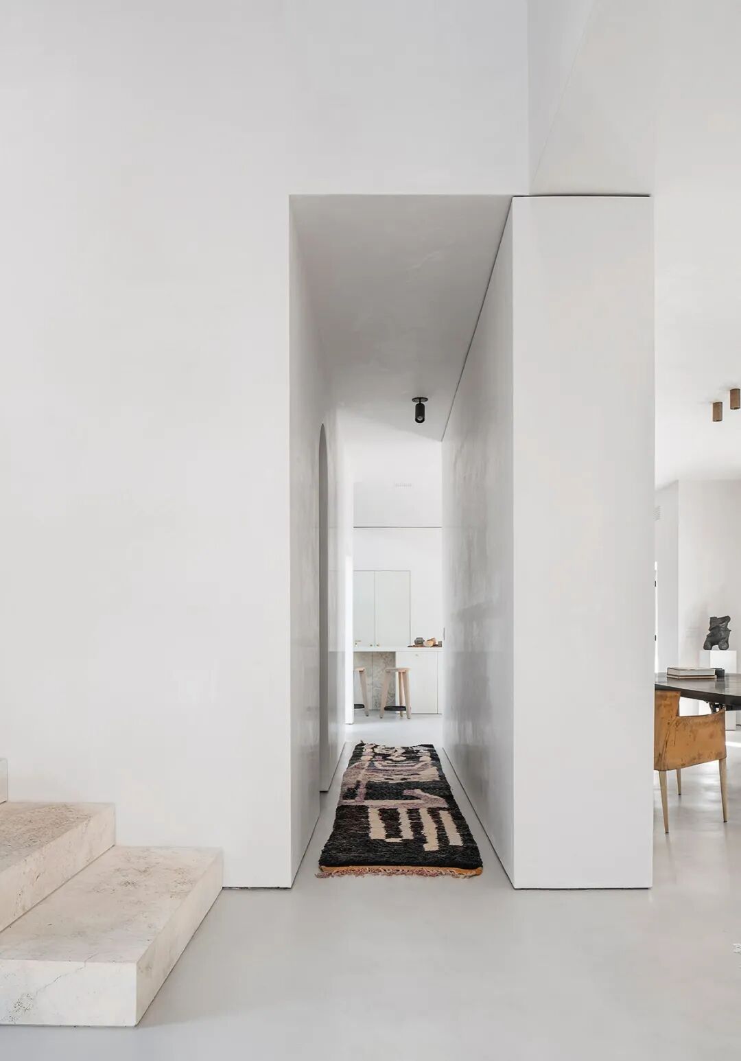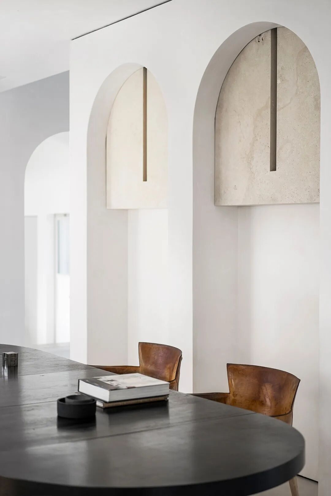 这所房子最初没有拱门,在Mandy Graham的设计下,拱门几乎穿透了整个空间。它定义了餐厅和厨房的组合空间,由一个小走廊隔开。拱门元素的应用,是Mandy Graham的项目中最经典的特征之一,它常常被视为古典甚至哥特式建筑的元素,然而对于Mandy Graham来说,在建筑中使用拱门元素是向装饰艺术的致敬,是在简洁的线条和触感的细节中体现了一种潜在的精致感。她 将曾经漫长而平静的走廊重新想象成一系列宏伟的拱门,让光影的柔和相互作用成为空间中的艺术。