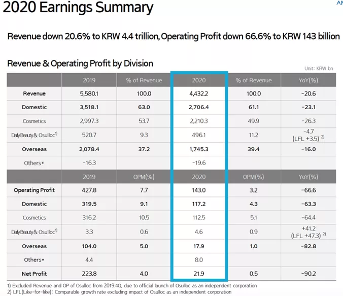 但从2017年开始韩流在国内的退潮,悦诗风吟业绩也一路下滑。根据爱茉莉太平洋发布的财报显示,2020年营业收入下滑21.5%,营业利润更是断崖式下滑近70%。
