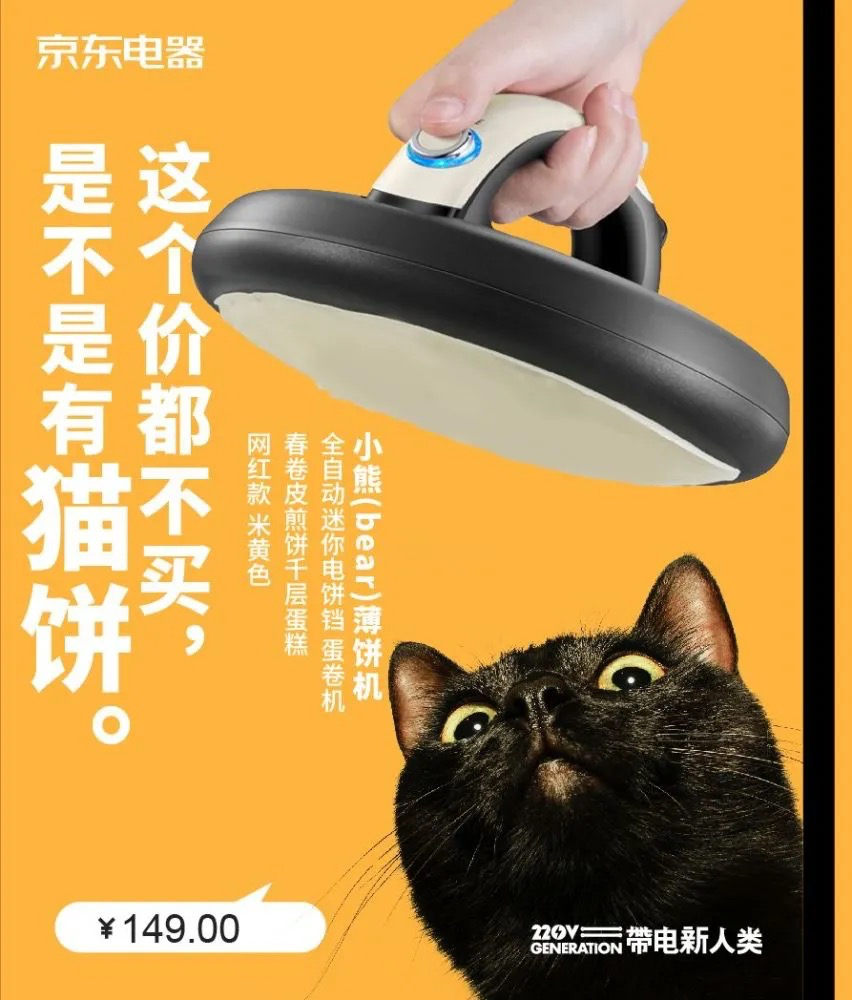 “有猫饼”谐音“有毛病”,毕竟有便宜不占可不是有毛病,同时也和产品薄饼机结合了起来,可爱又巧妙。