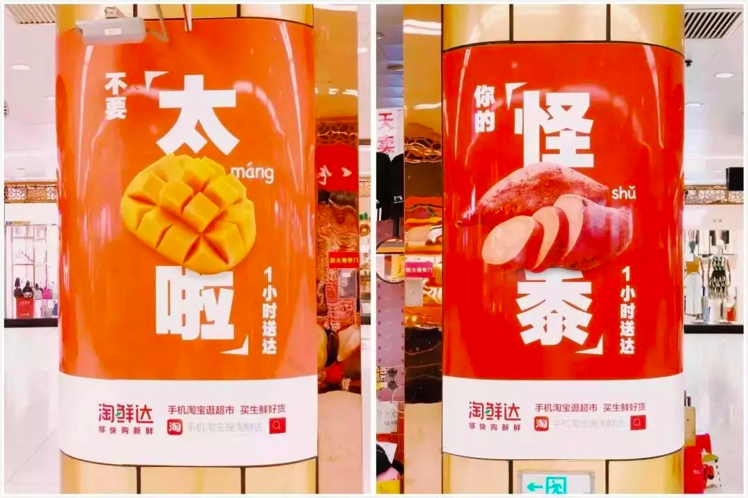 淘鲜达这一套谐音梗果蔬文案,把各类蔬菜水果和年轻人的流行语完美结合,显得俏皮可爱。