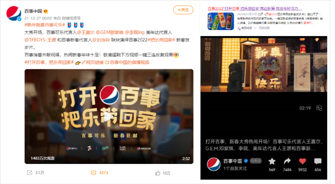 百事的这一套互动玩法机制简单实际且有趣。它将“乐”的基调,转化成场景多元化、社交分享化等特质在内的娱乐互动语言。人们通过数字化红包方式,表达自己的真情实感,在相互交流沟通中,增进情感,彼此之间的关系变得更加亲近。百事在满足人们“个性表达、社交创新”的同时,也以大众喜闻乐见的互动形式,直观展现出品牌活力。和每个人期待过年一样,百事每年的春节营销总是备受期待。就在狂人以为它还会和往年一样,春节必出街一部微电影的时候,百事却用全新的表达“乐”的方式,简单又直接地亮相于大众面前!今年,百事《把乐带回家》IP已经进入第11年,它为什么会做出与以往十年截然不同的决定,选择如此“直球式”的CNY营销打法?它又是如何延续IP中的“乐”这一精神内核,将“把乐带回家”的心智触达给受众的?只要细细回看百事今年的每一步操作,不难发现,百事看似「简单」的表达背后,策略思考其实一点也不简单。• 洞察大众对“乐”的情感,以年轻人之乐辐射带动全民之乐在短平快的传播环境中,人们身边充斥着各种各样的营销信息,接收内容的注意力逐渐被削弱,大众情绪也愈发内敛和敏感,简单纯粹的「快乐」无疑是一剂“良药”。百事今年的简单直接、给人以“直给的快乐”,是一次融入公众话语体系的发声,尽显品牌温度和真诚。共鸣消费者的深层情感诉求,追求“新春乐团圆”的真谛。用年轻的、直接的快乐,打造传递快乐氛围,传递最本真的共乐情感,帮助人们在春节真正放松下来,尽享新年之“乐”!它提醒人们发现生活里的“快乐”瞬间,同时用品牌之“乐”感染受众,告诉大家“快乐不需要讲什么大道理,本身就是件很简单愉悦的事情”。这种营销方式在当下疫后环境下,在中国新年这一愈发需要快乐的特殊时间节点中,更加直接有效。此外,在和目标群体的沟通过程中,百事不以某个人的“快乐”为出发点,而是通过「共乐」的概念和“公众情绪”产生共鸣,挖掘出“乐的诉求相通,乐的形式却各不相同”这一现象。百事以年轻人之乐辐射带动全民之乐,还原、放大人们日常里的春节乐趣,呈现出“众乐”的正确打开方式。在年轻化演绎和全民同频共振的“快乐”氛围中,百事“乐”的基调也在一直延续,“乐”的定义也被无限延伸。• 不是“新年之乐”在消失,而是“春节共乐”的方式在迭代几乎每过春节的时候,一部分人总会感叹“新年没有以前热闹了,快乐越来越少了”,其实不然。在传递“乐”的过程中,百事将数字技术和传统文化、春节习俗相结合,搭建春节「共乐」的场景,不断丰富人们对过年之“乐”的想象。不论是对过去春节的热闹场景用特效形式还原,还是当下大家一起通过网络媒介线上“抢红包”,新年的“快乐”一直都在,只是触达介质发生了改变,从原有的线下场景演变成线上线下全覆盖的方式。新春的热闹、乐趣没有减少,相反,共享乐趣的方式变得更加简单。• 内容营销再升级,《把乐带回家》IP中的“长期主义”春节,一直以来都是各大品牌方的“流量争夺地”,在海量的传播信息中,百事这次的“直球式”出圈绝非偶然。11年来,百事《把乐带回家》IP在内容上不断创新探索,表现出他人无法企及的年轻活力。从2012年邀请张国立出演的第一部温情微电影,到2016年猴年“六小龄童”的加入、2017年聚齐《家有儿女》原班人马.....再到2021年疫情之下乡村教师、外卖小哥的故事缩影、2022年简单的“乐在一起”,我们看到,基于不同时代背景和社会情绪变化,百事IP的“乐”的精神内核也在不断变化。它没有停留在短期的“流量打法”中,而是以“长期主义”思维为IP不断加码,持续强化自身品牌IP形象,传递品牌“年轻”和“快乐”的基因。百事《把乐带回家》,逐渐成为了一个品牌文化符号,人们一提到“百事可乐”,除了自然联想起那句“祝你百事可乐”,也能立马想起这个一直坚持和大家“乐在一起”的品牌。对于众多品牌来说,百事今年这一整套化繁为简、层层递进的创新营销打法,既为春节营销内容注入了新的活力,也以亮眼的出圈成绩树立春节营销标杆!
