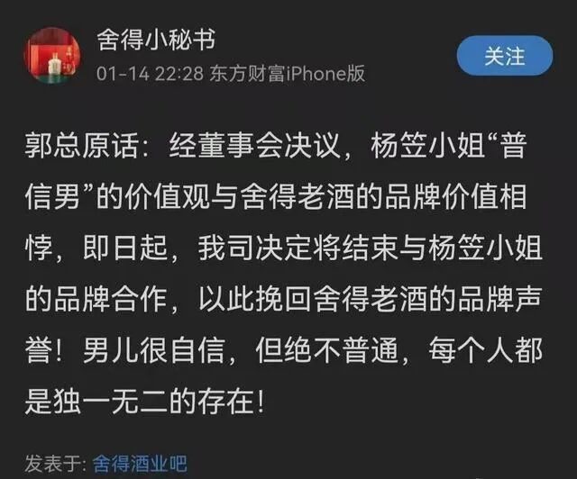 更可怕的是,不少网友冲向了舍得酒业的官方旗舰店和直播间,各种辱骂刷屏,让当晚的主播很是无奈。1月14日晚,一个名为“舍得小秘书”的微博用户,发了一条引用舍得酒业郭总言论原文的微博,表示品牌已经和杨笠解约。文末还加了一句“男儿很自信,但绝不普通”的豪言壮语。