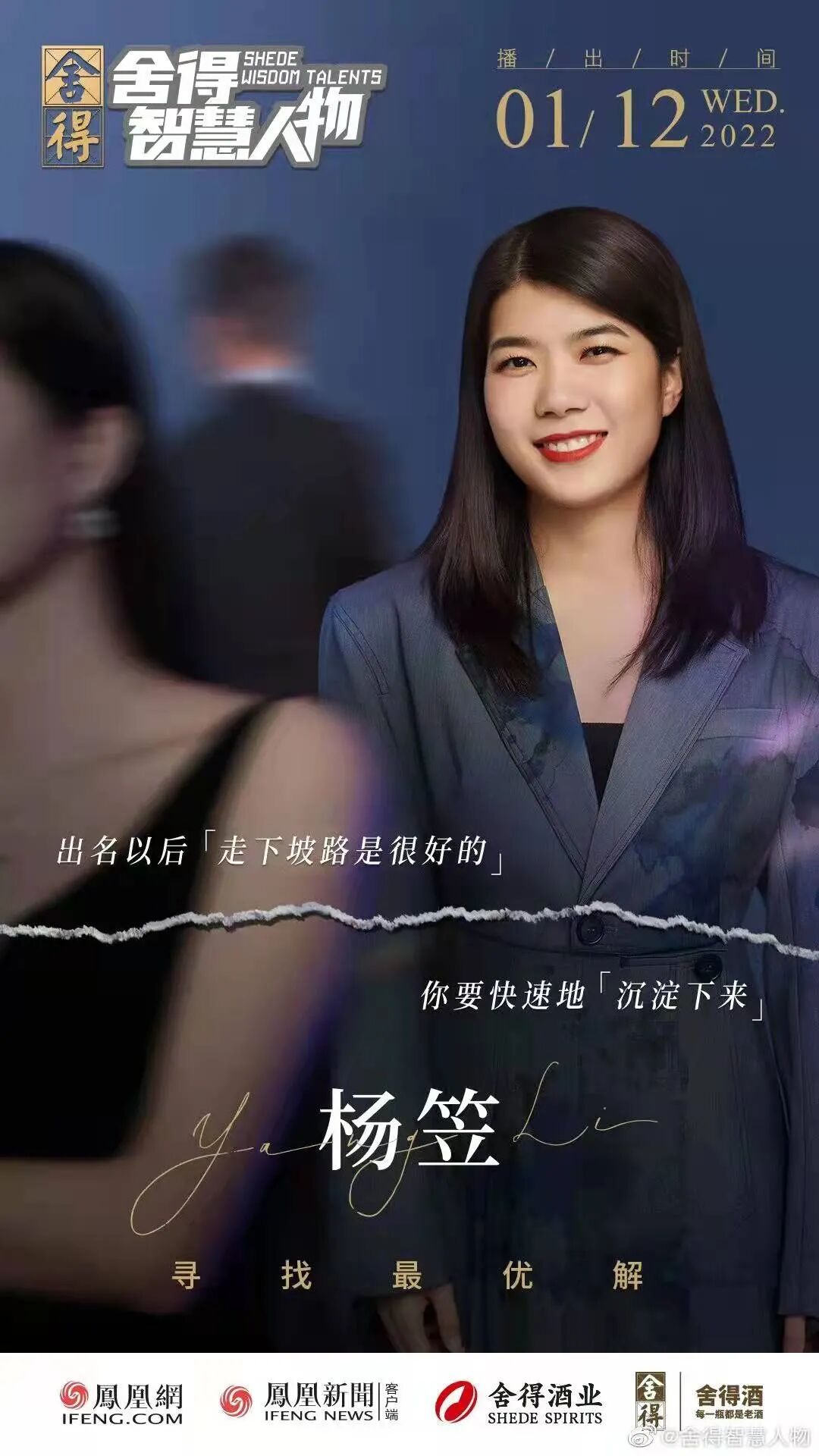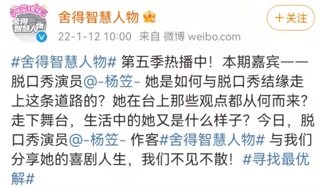 最近,杨笠又一次因为代言惹上了争议。如果说此前的英特尔、奔驰还有部分女性受众的话,这次就更离谱了。1月12日,在舍得酒业与凤凰网联合打造的脱口秀《舍得智慧人物》中,邀请杨笠作为节目嘉宾。