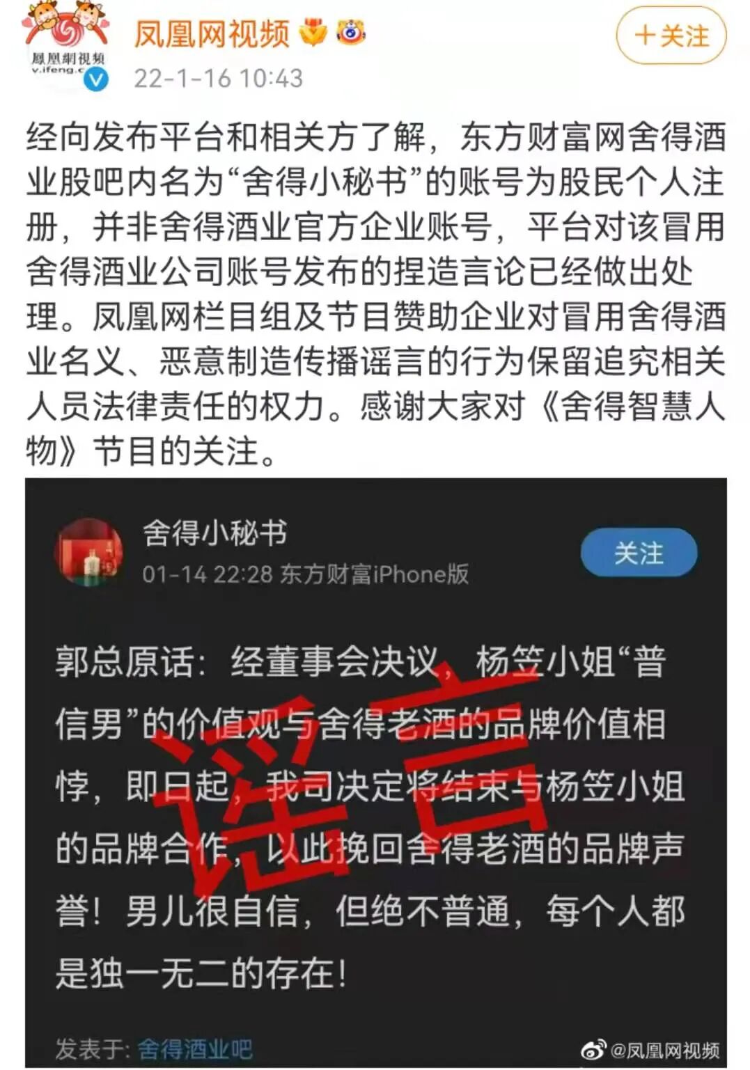 就在网友们为舍得酒业和杨笠解约“喜大普奔”各自站队时,更劲爆的新闻来了。1月16日上午,凤凰网视频发布微博,直指那个所谓的“舍得小秘书”微博内容不属实,图片还打上了鲜红的“谣言”两个字。