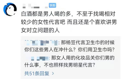 结果宣传一出来,网友立马质疑:白酒都是男性喝得多,不至于找女性代言吧,还是个喜欢讲男女对立问题的人。