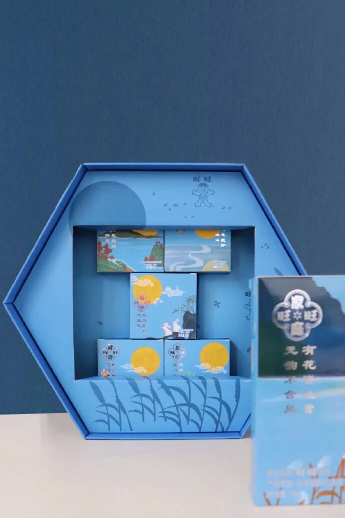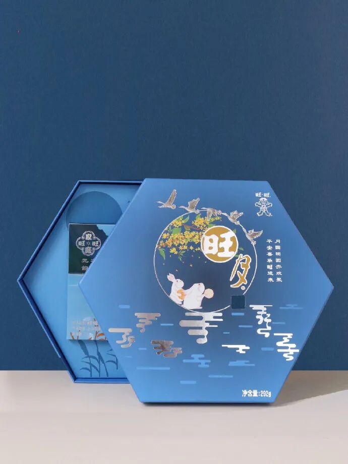 在中秋节的礼盒上也顺应节日,采用素雅六边形蓝色礼盒,意境悠远。