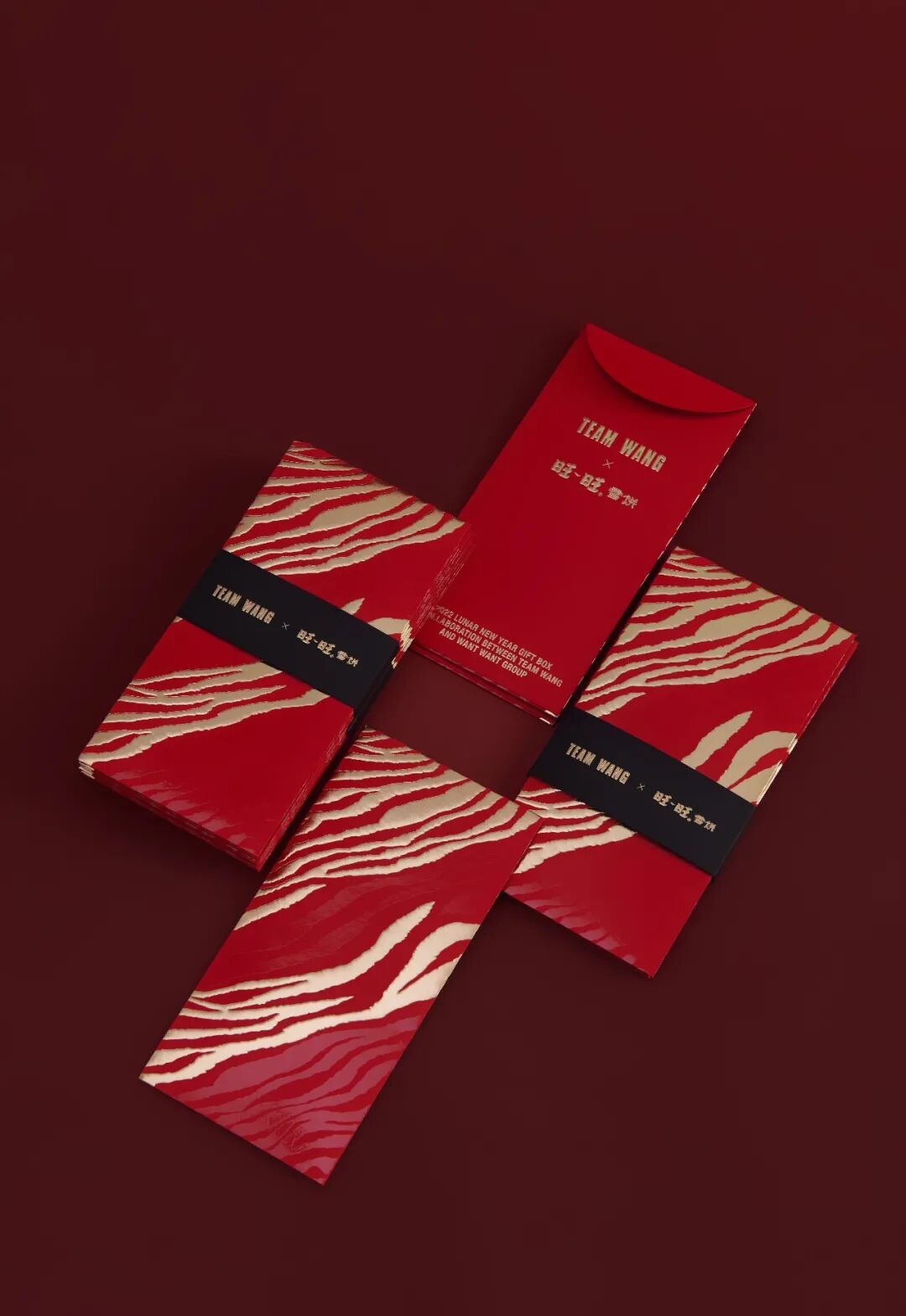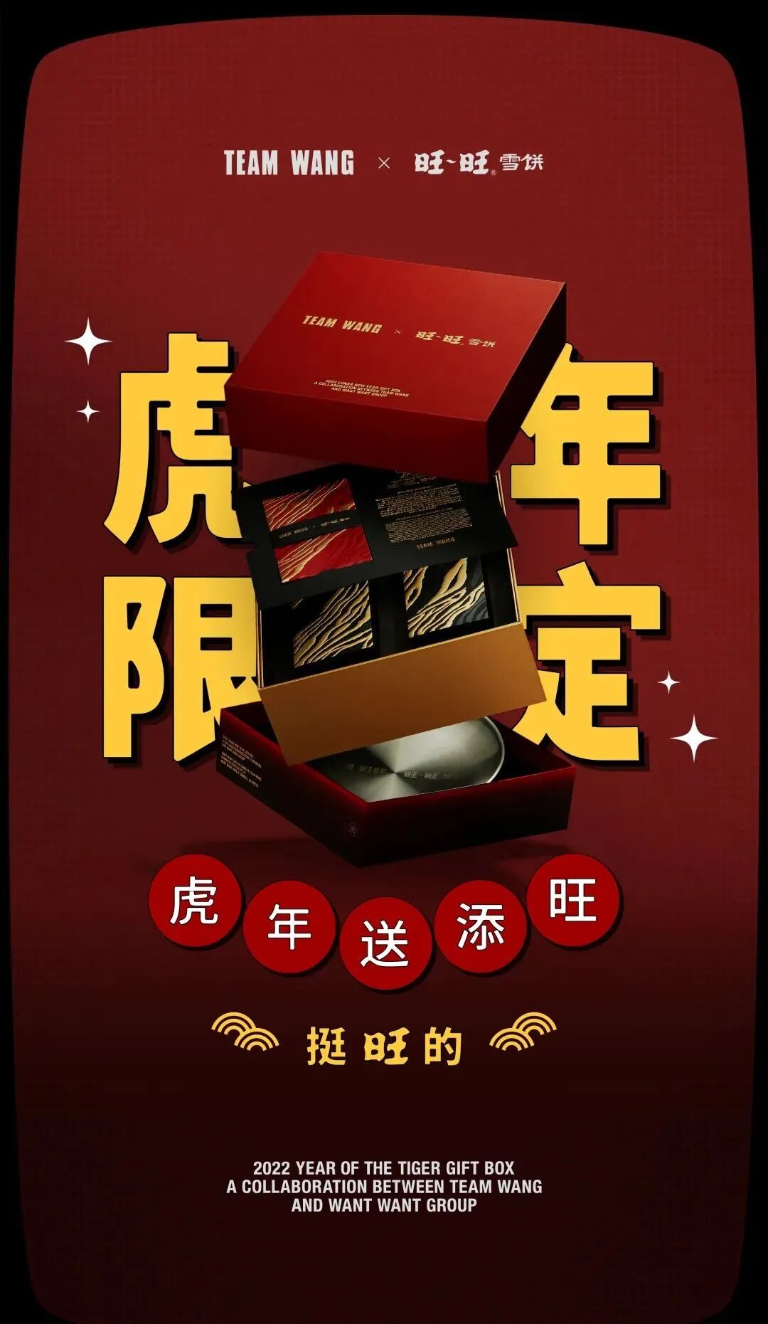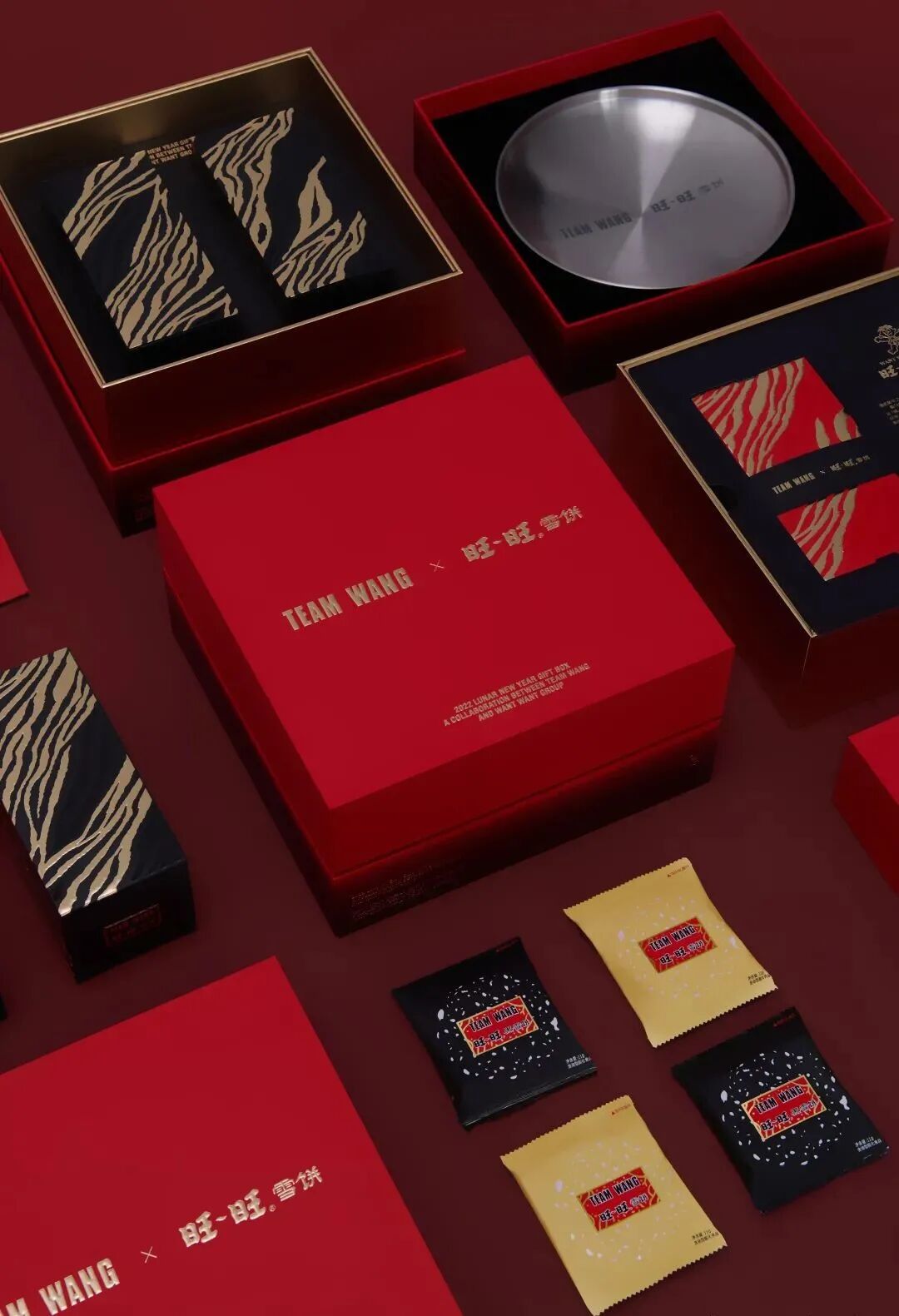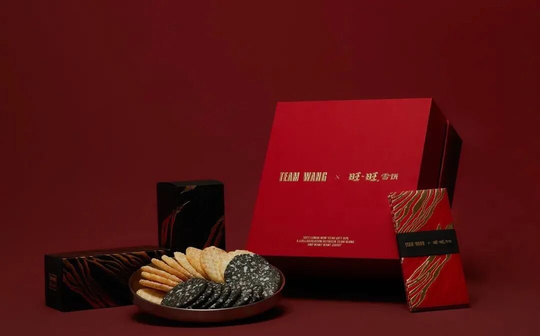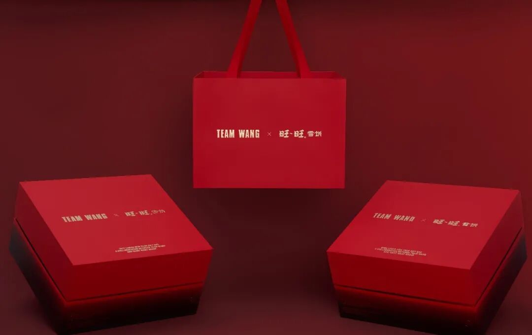为了迎合新年气氛,礼盒的外包装采用了红色,TEAM WANG 与旺旺雪饼的名字用烫金的形式呈现在礼盒上。