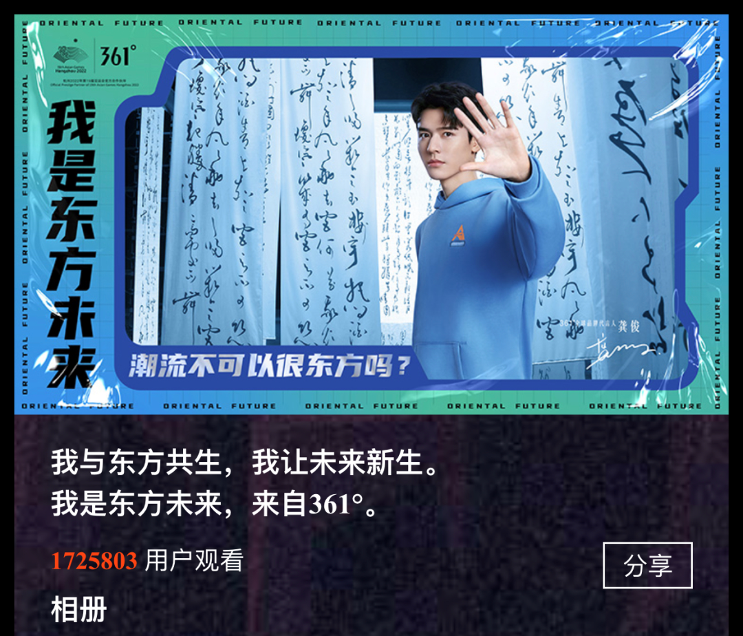 由全球品牌代言人龚俊出演的TVC《我是东方未来》是这次传播的重心。从传播的角度来看,在前期微博预热和龚俊本身明星势能的加持下,TVC发布即占领了传播的制高点,引发了很高的关注度。而从内容的角度来看,这支TVC以龚俊之口,输出的其实是361°的品牌态度。突破运动、探索边界、重构传统、东方潮流,可谓每一个标签都打在了人们对361°的认知上。但至于为什么会输出这样的观点,我们将在下一部分解释。左右滑动查看更多