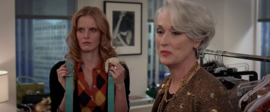 事实上,这种天蓝色产生了上百万美元的利润和数不尽的工作机会……还有为之付出的难以计算的用心……好笑的是你觉得你穿的这件衣服是你自己选择的,以为你的选择是在时尚产业之外,但实际上你穿的这件毛衣就是这间屋子里的人齐心为你选的,从这一堆玩意儿里。”