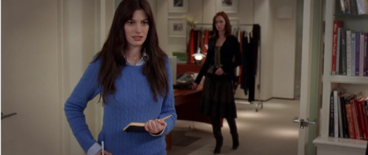 当时安妮·海瑟薇身上穿了一件天蓝色的粗毛衣,然后主编米兰达指着这件毛衣发表了一段长长的话,教训了安妮·海瑟薇。这段台词是我认为这部电影的精华。她是这么说的——