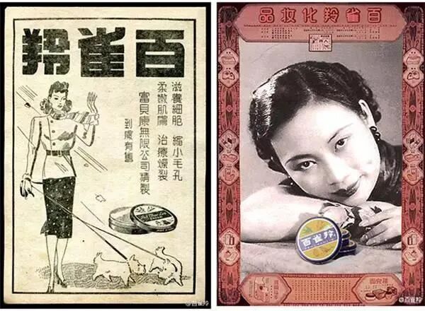据资料显示,百雀羚初期LOGO是用四只鸟雀站在品牌名称上来强化形象,给消费者一定的心智认知。而“百雀羚”这三个字体,以手写字体的笔画去呈现。在配色上,采用醒目亮眼的颜色,以达到快速吸引的大众的眼球。这样的设计蛮符合当时的审美。而当年百雀羚的广告海报,也是审美在线。放到现在来看,复古的配色以及版式设计,都非常值得参考。