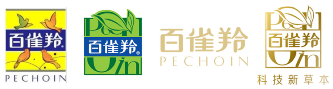简单来说,从2018年到现在,百雀羚使用过的LOGO版本有以下三款:其中,这个蓝绿色版本的LOGO,相信大家很熟悉了。LOGO中部是蓝底白字的品牌名称,上下两部分将品牌外文名“Pechoin”,和形如叶子又如翅膀的元素,融合在一起作为背景。接着,提取了“百雀羚”原本的字体设计,而外文名“PECHOIN”则是以纤细的设计位于底部。再到现在这款以“蓝绿”版本LOGO图形为基础,统一成金色调,并作渐变处理。(怪不得看着这新LOGO这么眼熟)新LOGO以金色渐变的形式呈现,也变得更加简洁时尚。而底部“科技新草木”文字,也体现了LOGO变化,是随着品牌的新定位而改变的。其实新LOGO在近些年,已经延展到了各种产品上。简洁时尚的LOGO设计,也为产品增添了高级感。
