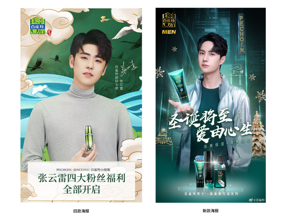 从代言人新旧款海报也可以看到,设计风格也随着LOGO发生了变化。旧海报的背景以插画风的形式设计,符合“蓝绿”配色LOGO的风格。而与新LOGO搭配的海报风格,更显现代科技感。总的来说,百雀羚其实就是保持LOGO上在“形不变”的基础上进行调整,保留品牌视觉资产的同时转换风格。小编顺势回顾了一下百雀羚的品牌历程,发现这个国产品牌无论是LOGO的变化,还是产品设计,都透露着满满的“野心”。