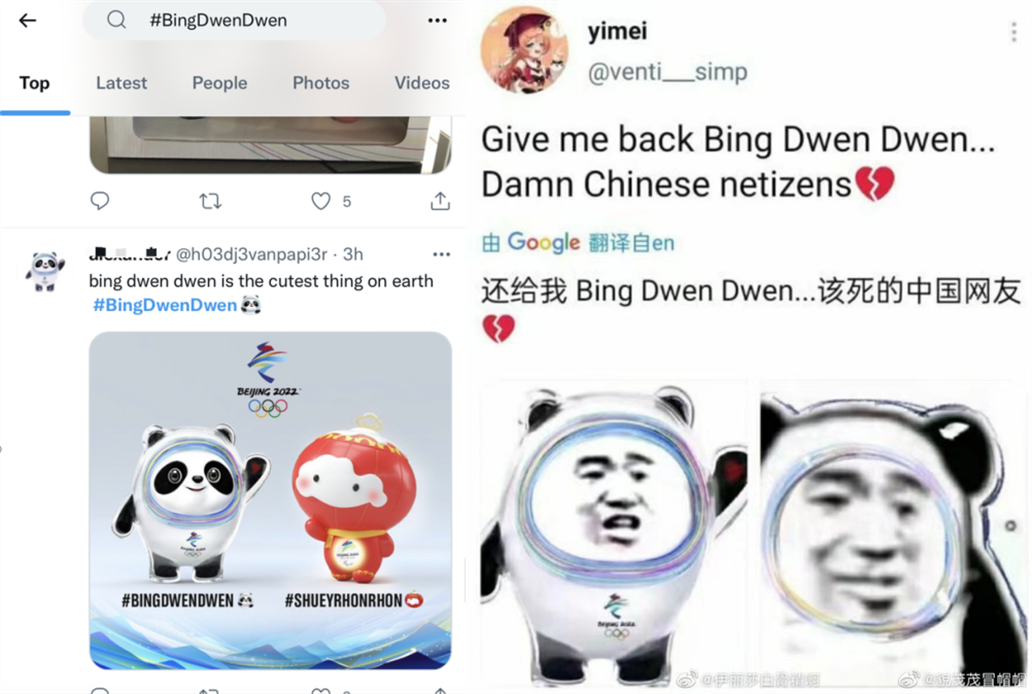推特上,除了Bing Dwen Dwen相应的专属话题外,很多国外网友开始从小红书、微博等国内平台寻找冰墩墩的内容,反向输出,如当头像,熟练使用表情包。