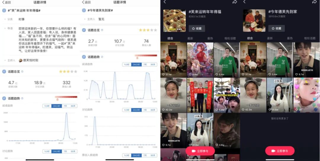 德芙前期在抖音平台发起的“全民盼福”,以及之后在快手平台发起的“福句绕口令”挑战赛等趣味玩法,都能够很好的撬动用户兴趣,引导用户参与其中,通过亲身体验近距离感受品牌想要传递的主张,自然事半功倍。