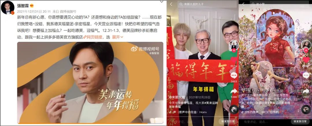 这支短片在社交平台一经发布,便收获不俗反响。大量影响力明星和KOL踊跃参与,认领属于自己的“专属福星”,助力德芙新春活动在各大热门社交平台快速发酵,迅速进入大众视野。