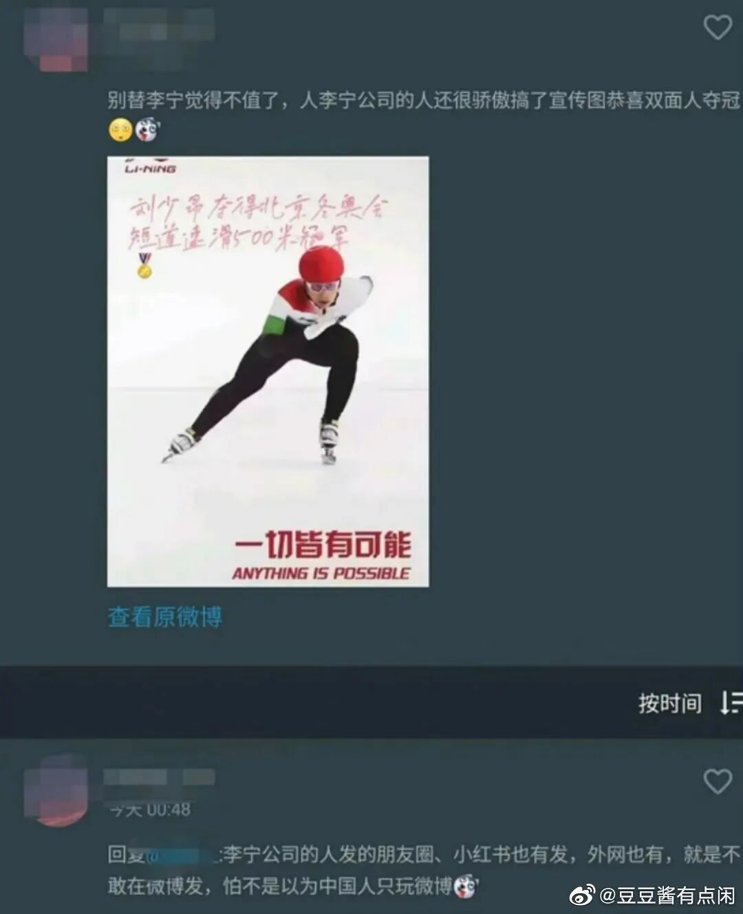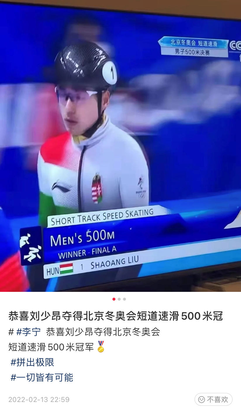 有网友发文称:中国李宁赞助了匈牙利代表团,赞助了刘少林刘少昂。甚至李宁的销售都暗戳戳地在小红书、朋友圈庆祝刘少昂夺冠:整件事可以说朝着很一致的方向发展,就是李宁被嘲得很惨。。企业赞助是品牌推广的途径之一,赞助其他国家也很正常,这次被骂是被这俩兄弟的风评害了。刘少林1km短道速滑决赛被判违规,刘少昂被问道怎么看待这件事上直接来了个变脸。接受国内媒体采访的回应:自己不是裁判,尊重判罚的结果。接受外网采访的发言:我认为这是一场不公平的比赛,刘少林不该受到这样的判罚。。
