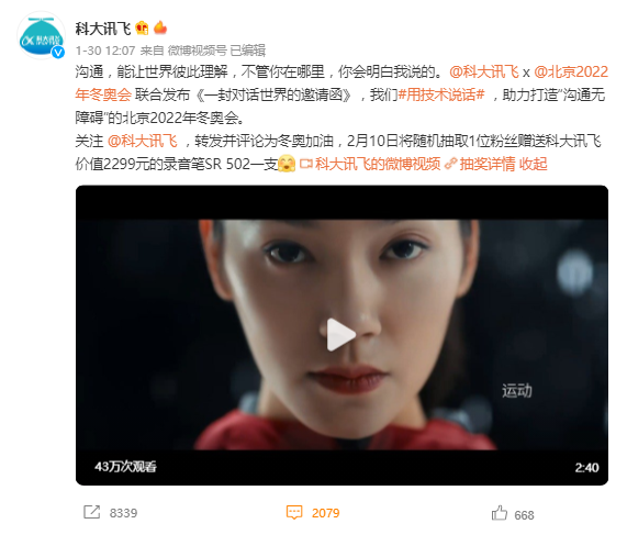 冬奥会火热开展之际,科大讯飞发布宣传短片《一封对话世界的邀请函》,从冬奥会不同参与者的视角切入,呈现出一个科技助力打造「沟通无障碍」的北京冬奥会。