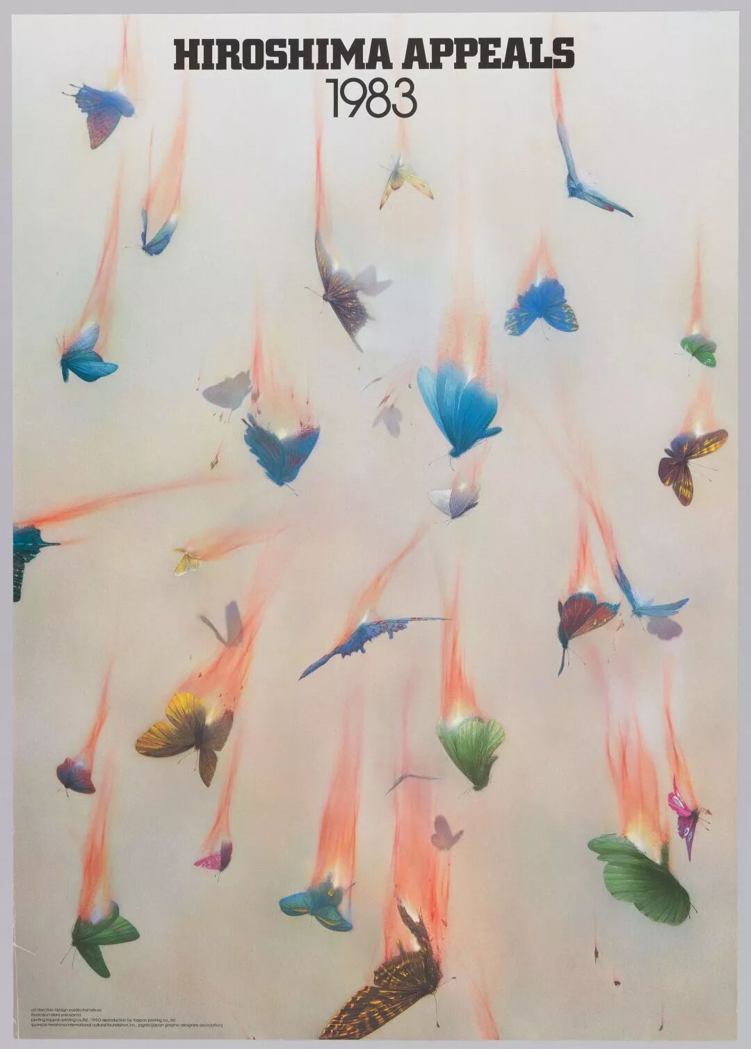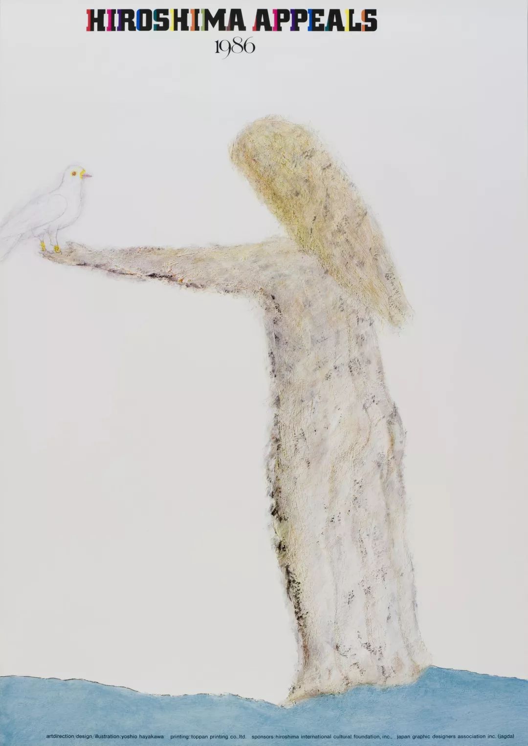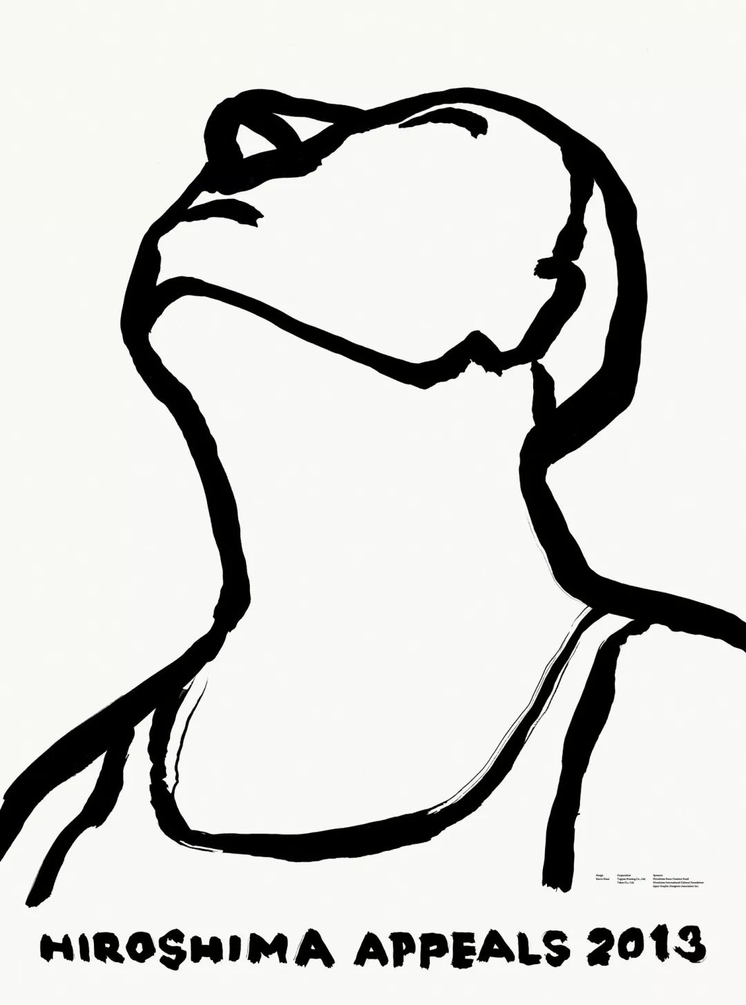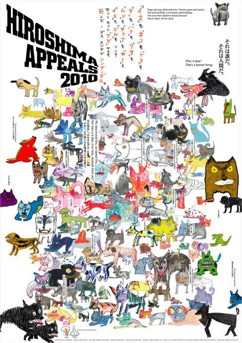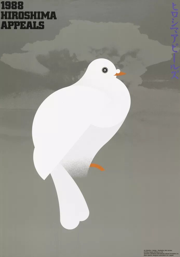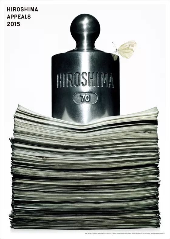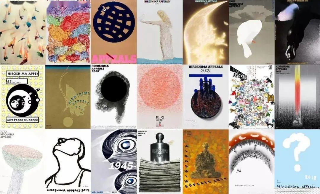 作为延伸阅读,回到最初的大貫卓也获奖海报,它本身其实为一个命题创意主题作品,来自于《广岛呼吁》。《广岛呼吁》由日本平面设计师协会(JAGDA)、广岛和平创造基金和广岛国际文化基金会于1983年共同创办发起,是一项以平面设计为主导的和平宣传活动。该项目每年邀请一位设计师,以“广岛呼吁”为主题创作一张年度海报,以中立的视角,表达“反战精神”。首张“广岛呼吁”海报,由JAGDA首任会长龟仓雄策创作,至今共有23位设计师参与(注:这项活动1990年因故中止,2005年重启)。