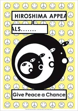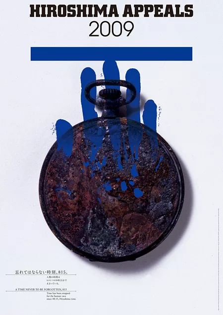 这张作品整整花了设计师两周进行制作,在表达和平的同时,创作本身也成了一种过程。设计师认为,这一种对于设计的“劳作”,也是一种针对战争与和平的思索与反省。以广岛博物馆作为底部中心进行的设计,将战败作为起点,通过对于战后的反思,引导人们理解与接受现实,并逐渐振作,是一幅面向未来思索的作品。20年前, "绝不能忘却的物语(忘れてはイケナイ物語り)"的企划与《战争童话集》等作品涌现,并不断的向世界传达爱与和平的信息。这张“MAD DOG”的海报是这项企划的延展。设计师希望能以海报为媒介,向世界传播爱与和平。· 2009年 浅叶克己 「 忘れてはならない時刻、815。」·怀表滴答滴答地走着,即使在那一天也正确地显示着时间。那是一个晴朗的早晨,时针走到了八点,然后是1945年8月6日上午8点15分,广岛上空爆发出明亮的红光,随着这道闪光,道路上的一切都飞了起来。· 2008年 青叶益辉 「市民参加のスタンプポスター」·这张海报是设计师与广岛的公民一起制作的。参与者代表广岛、代表日本乃至全世界的和平爱好者,按下了“和平”的印章,由此制作而成了这张海报。在日常生活中,作为“和平”印章的替代,作者希望人们在日记、电子邮件和信件的末尾写上“Peace”,像是 "保重,希望下次再见,Peace!"或" 今天也是美好的一天,Peace!“这样的话,呼吁永久的和平。· 2007年 松永真 「NO MORE HIROSHIMA!」·通过漆黑的画面,作者希望未来不再会有核战争的发生。在古代,人们相信死者会转世为蝴蝶。在世界各地的冲突中死去的无数的人化身为蝶,而设计师的画面让人们意识到了现代世界中的和平有多么脆弱,作为对停止战争的呼吁。· 2005年 仲条正义 「Give Peace a Chance」·