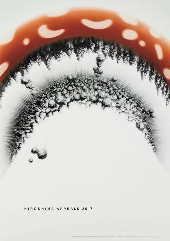 1983年的第一张海报名为“燃烧的蝴蝶”,由当时的JAGDA会长龟仓雄策亲自创作,并在之后的“国际海报展”中获得了最高奖项,在国内外都引起了巨大反响。自从原子弹蘑菇云在广岛腾空而起以来,73年已经过去了。然而如今,却仿佛什么都没有解决,就像许多问题依旧悬在半空中。海报表现的就是2018年世界的现状。· 2017年 原研哉「HIROSHIMA APPEALS 2017 キノコ図」· 原研哉的作品是一幅对于蘑菇云的仰视图。他和相识30年的水谷吉法合作,通过想象与摄像技术的结合,展现了蘑菇云中心的场景。· 2016年 上条乔久 「祈りの風景」·