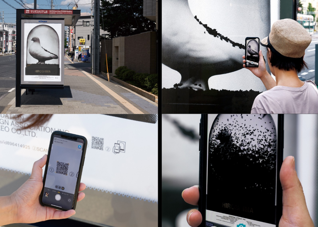 它的海报主体是一个雪花球,雪花球内是一只象征着和平的白鸽,不同于常规雪花球的白色雪花,里面装的是黑色粉末。这张海报最大设计特点在于,采用了增强现实(AR)技术,当用手机扫描照片时,黑色粉末从底部开始飞扬,最后将雪花球填满,犹如被战争、黑雨等压垮一般窒息。最终粉末缓缓落到地面,犹如灾难过后的灰烬,带给人深刻的沉思。从70多年前开始,平面设计从海报到多种媒体,依托于科技的跃迁,平面视觉的表现不断迭代。而今天,AR技术的更新应用,将原本存留于2D表面的静态视觉展现,通过作者之手,以更为立体的形式体现了出来。