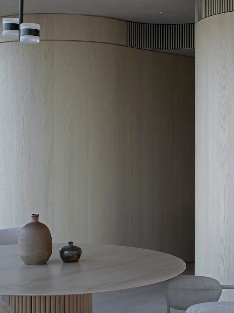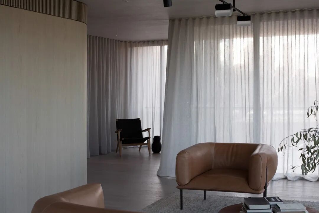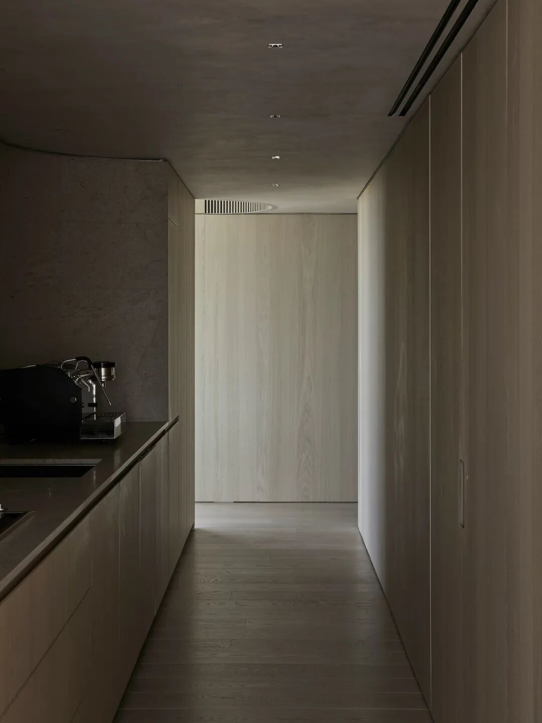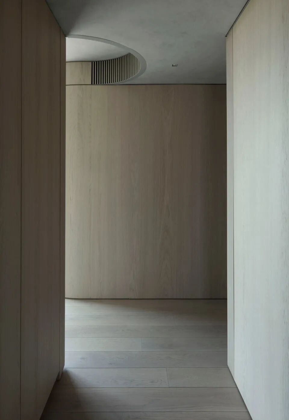 对物质和空间探索是Edition Office的雄心所在,他们将其与变革和更新相结合,设计了这个住宅,使身处其中的居住者留意时间的流逝,与自然环境的微妙。这是Edition Office送给客户的珍贵礼物。“空间的本质上其实很简单,它是一个精致、平静的避难所,设计师应当于其中恢复人类本应有的自由感。”这座住宅位于墨尔本的市中心,与墨尔本艺术区和皇家植物园的美景毗邻。室内主要通过柔和的调色板、分隔的空间和宽阔的曲线营造出温暖的氛围。Edition Office将空间的本质上理解得很简单,即一个精致、平静的避难所,恢复人类本应有的自由感。考虑到这一点,Edition Office开始通过强调形式、功能,用原始、真实的材料来铸造这个空间。墨尔本公寓颠覆了传统的家居布局,采用无门的“L”形平面布置。这间公寓原本是由单纯的直线组成,而在Edition Office的翻新后,通过巧妙放置的弯曲墙壁限制视线,保护了生活隐私。每个圆形体量的外部都衬有涂油的白橡木,而内部则覆盖着灰色的花岗岩瓷砖——工作室认为这两种材料可以抵消公寓楼的“质感冷漠”。客厅后面,一堵弧形的墙壁被设计成一个安静的阅读角落,上面铺着弯曲的灰色花岗岩瓷砖,在另外一个弧形的区域里是是一个独立的办公桌,一个用赤陶皮革软垫的长椅巧妙地将其与客厅联系在了一起。 曲线体现了整个家庭的“连续功能”,使得光影的质量得以提升,并保持每个空间的凝聚力,即空间与空间的界限变得模糊。赤土色调的皮革椅产生一种色彩褶皱,与柔软的灰色扶手椅和地毯形成对比。灰色薄纱铺满地板,包裹着房屋,柔化了都市景观,营造一种平静的生活气息。厨房位于住宅核心区域的一条狭窄通道上,储藏室木橱柜后面隐藏的电器,作为墙壁的一部分,整个通道简约而干净。内敛的色彩和材料装饰了这条通道,通向开放的客厅和餐厅。进入主卧室,一致的灰色调唤起舒适和封闭的本性,折皱包裹在同样的原始亚麻薄纱中。Flag Halyard 椅为极简的空间注入了丹麦的设计感和纹理。在 Edition Office 设计的墨尔本公寓中,空间的轮廓设计至关重要,它是空间叙事感的源头,是探索一种新的都市公寓生活方式,也是回归自然的现代主义。本文系作者授权首席营销官发表,转载请联系该作者