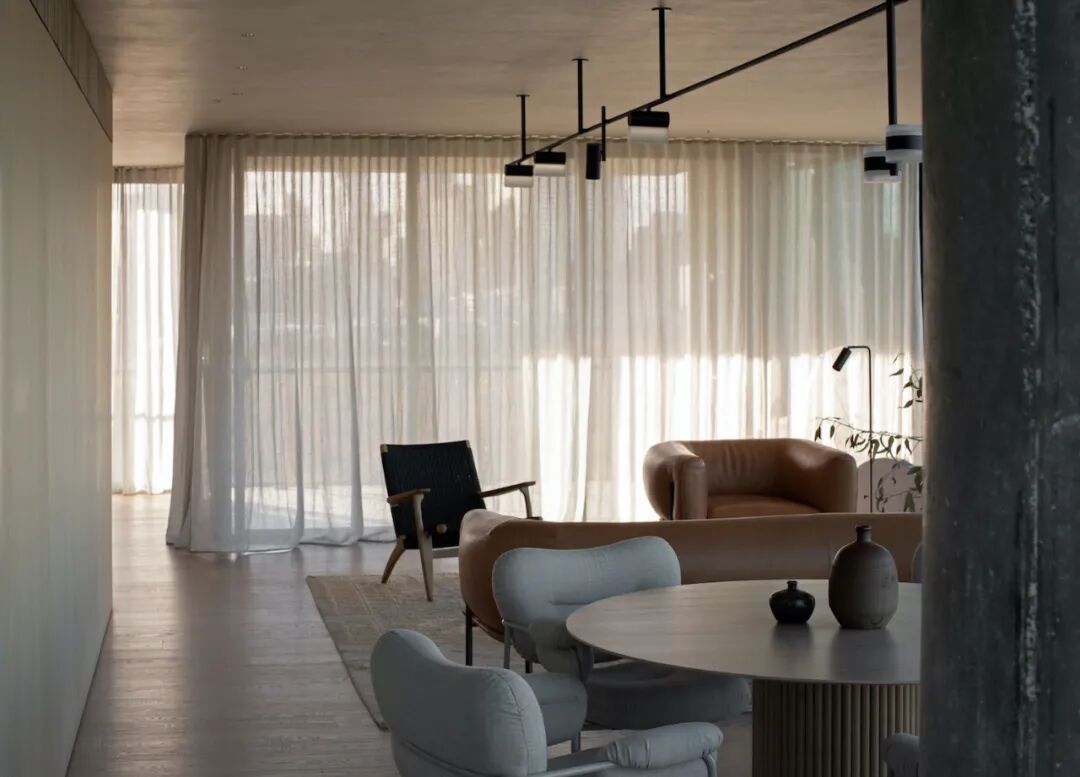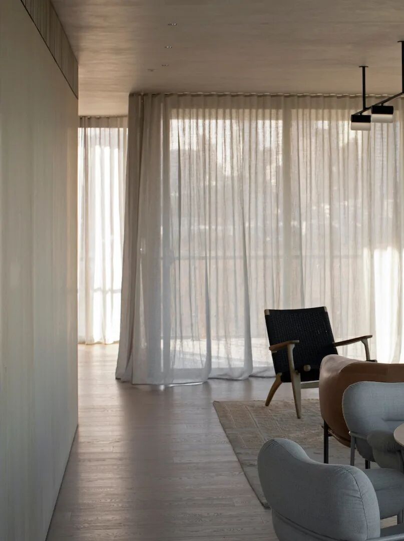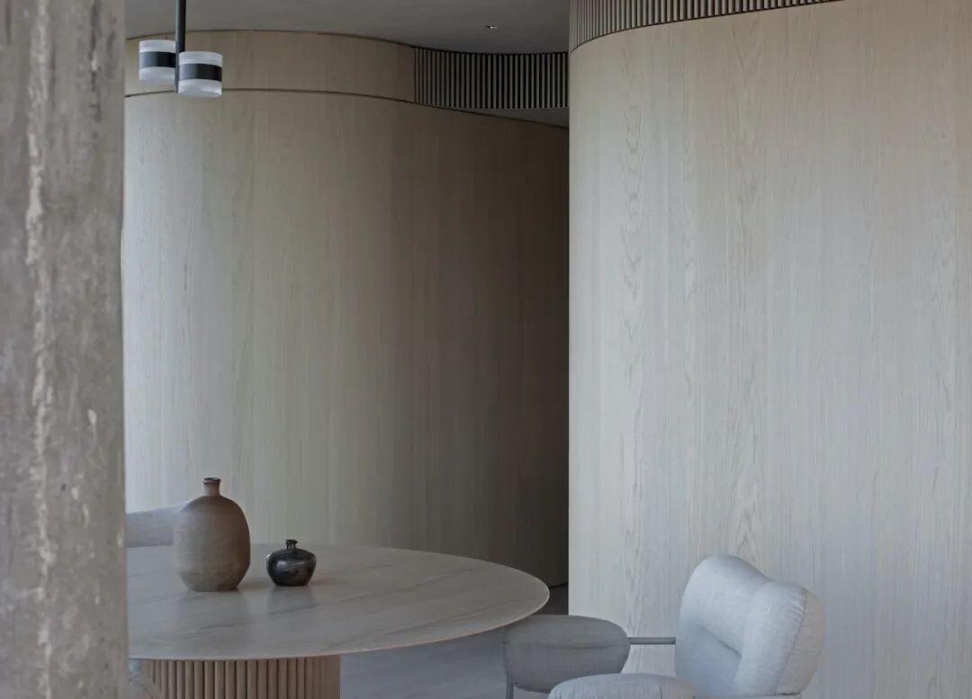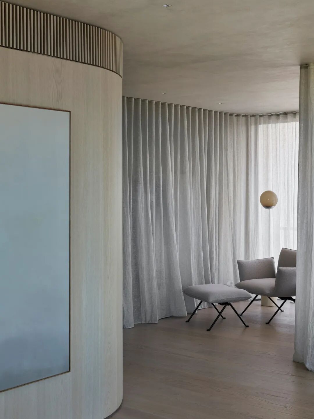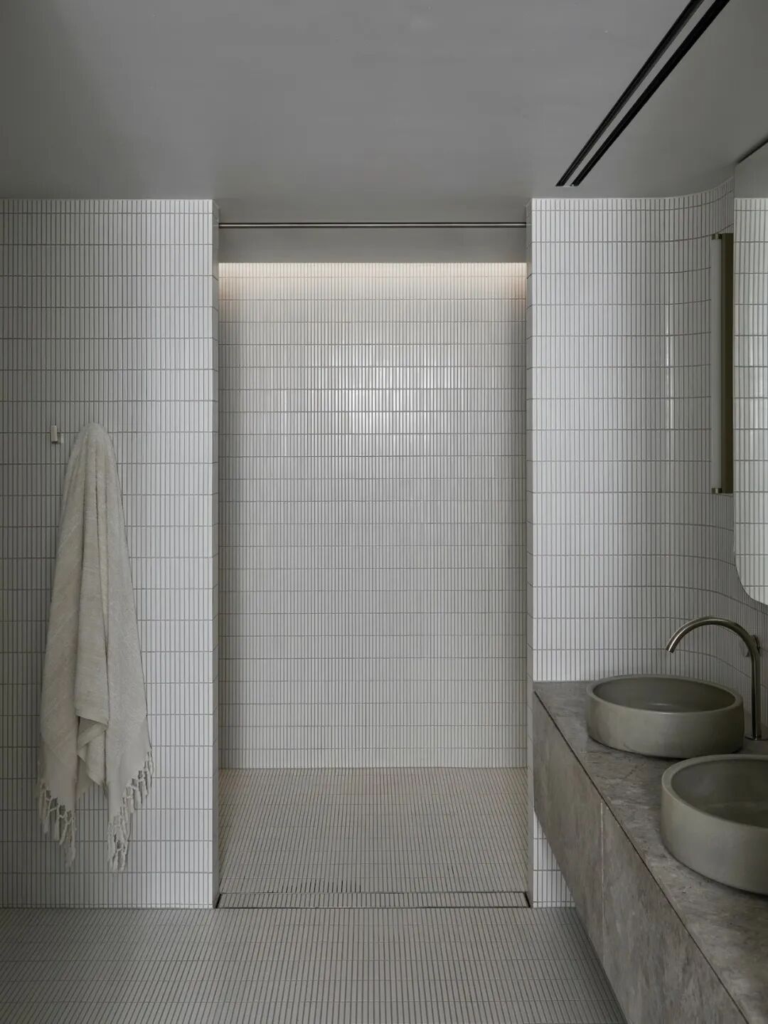 对物质和空间探索是Edition Office的雄心所在,他们将其与变革和更新相结合,设计了这个住宅,使身处其中的居住者留意时间的流逝,与自然环境的微妙。这是Edition Office送给客户的珍贵礼物。“空间的本质上其实很简单,它是一个精致、平静的避难所,设计师应当于其中恢复人类本应有的自由感。”这座住宅位于墨尔本的市中心,与墨尔本艺术区和皇家植物园的美景毗邻。室内主要通过柔和的调色板、分隔的空间和宽阔的曲线营造出温暖的氛围。Edition Office将空间的本质上理解得很简单,即一个精致、平静的避难所,恢复人类本应有的自由感。考虑到这一点,Edition Office开始通过强调形式、功能,用原始、真实的材料来铸造这个空间。墨尔本公寓颠覆了传统的家居布局,采用无门的“L”形平面布置。这间公寓原本是由单纯的直线组成,而在Edition Office的翻新后,通过巧妙放置的弯曲墙壁限制视线,保护了生活隐私。每个圆形体量的外部都衬有涂油的白橡木,而内部则覆盖着灰色的花岗岩瓷砖——工作室认为这两种材料可以抵消公寓楼的“质感冷漠”。客厅后面,一堵弧形的墙壁被设计成一个安静的阅读角落,上面铺着弯曲的灰色花岗岩瓷砖,在另外一个弧形的区域里是是一个独立的办公桌,一个用赤陶皮革软垫的长椅巧妙地将其与客厅联系在了一起。 曲线体现了整个家庭的“连续功能”,使得光影的质量得以提升,并保持每个空间的凝聚力,即空间与空间的界限变得模糊。赤土色调的皮革椅产生一种色彩褶皱,与柔软的灰色扶手椅和地毯形成对比。灰色薄纱铺满地板,包裹着房屋,柔化了都市景观,营造一种平静的生活气息。厨房位于住宅核心区域的一条狭窄通道上,储藏室木橱柜后面隐藏的电器,作为墙壁的一部分,整个通道简约而干净。内敛的色彩和材料装饰了这条通道,通向开放的客厅和餐厅。进入主卧室,一致的灰色调唤起舒适和封闭的本性,折皱包裹在同样的原始亚麻薄纱中。Flag Halyard 椅为极简的空间注入了丹麦的设计感和纹理。在 Edition Office 设计的墨尔本公寓中,空间的轮廓设计至关重要,它是空间叙事感的源头,是探索一种新的都市公寓生活方式,也是回归自然的现代主义。本文系作者授权首席营销官发表,转载请联系该作者