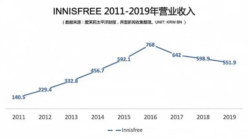 事实上,2017年悦诗风吟业绩下滑,颓势显现。到2019年,它的全球营业收入为5519亿韩元(约31亿人民币),比2016年巅峰时期少了近2000亿韩元。