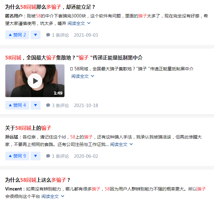 俗话说,没有无缘无故的爱,也没有无缘无故的恨。大众对于58“骗子网站”的认知也是多年积累的结果。