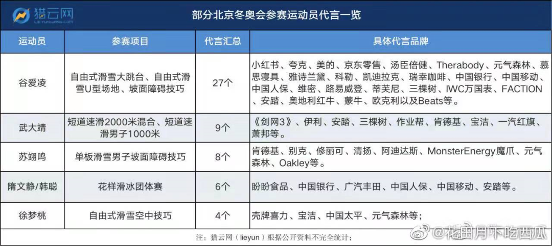 不过,在给苏翊鸣助威的同时,也有网友质疑起了谷爱凌的商业代言。毕竟,相比苏翊鸣目前的8个代言,谷爱凌的品牌合作已经高达27个,远超其他运动员。