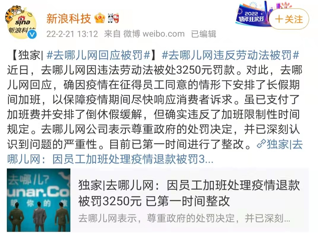 好家伙!去哪儿网因为加班被罚还委屈上了?