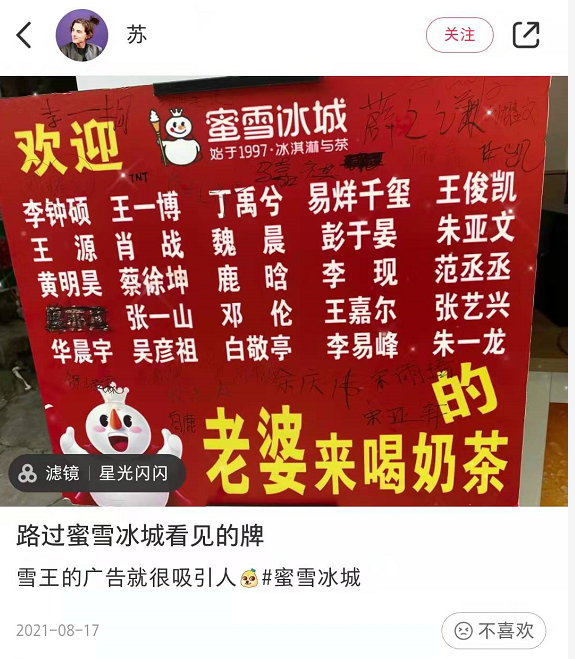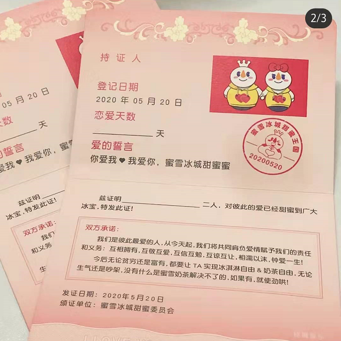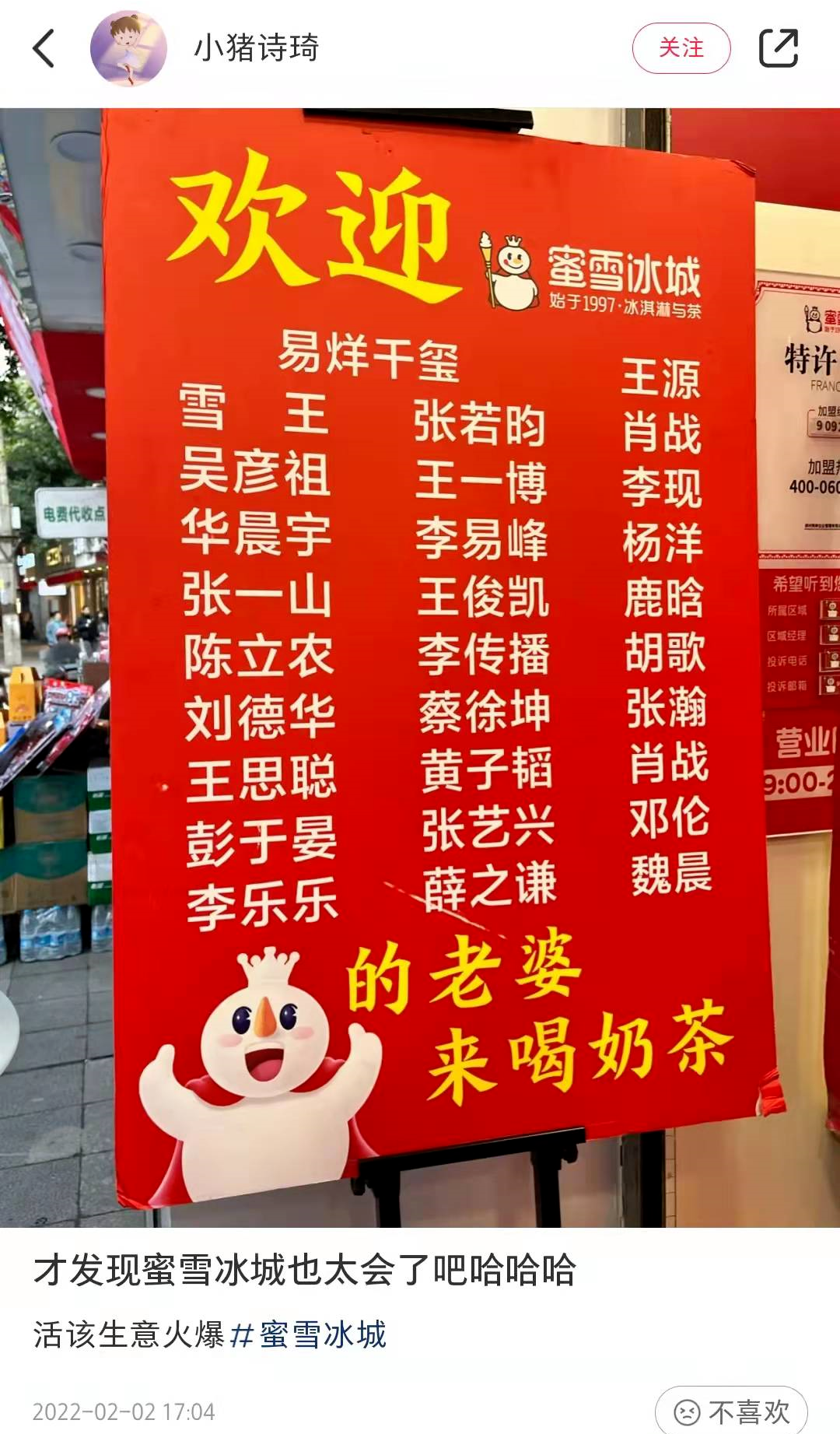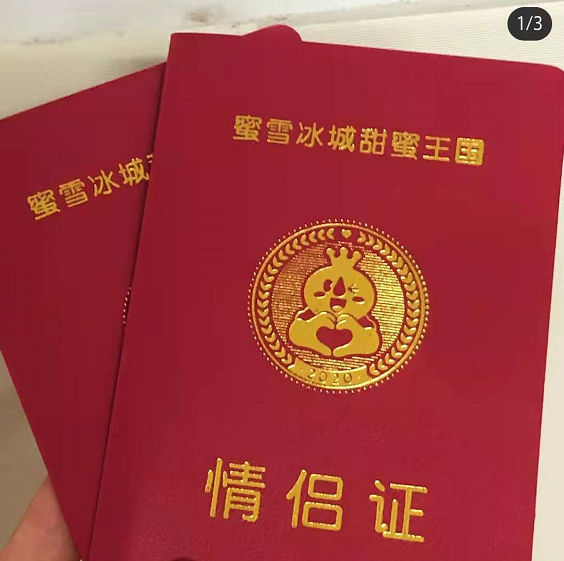 你还真别说,除了着眼于大家的脱单大事,蜜雪冰城还发过情侣证:可以说是把“我爱你你爱我,蜜雪冰城甜蜜蜜”贯彻到底了?不过,圈佬觉得更有意思的是,蜜雪冰城除了低价的特质以及甜蜜蜜洗脑歌和弹性十足狂斗舞的雪王之外,经常能发现各个门店会有的一些颇有活力,拿捏人心的经营亮点——评论区有表示自己偶像不在内的,以至于只能自己写的: