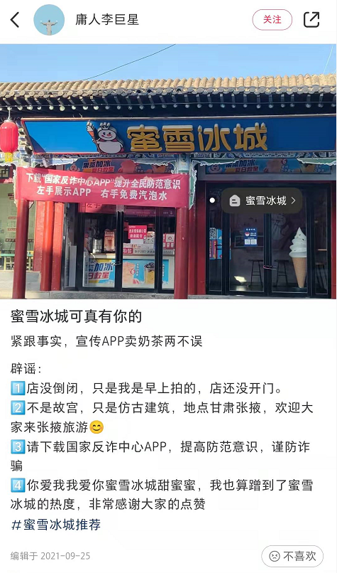 去年9月,下载国家反诈APP宣传正浓时,蜜雪冰城可凭APP领免费气泡水: