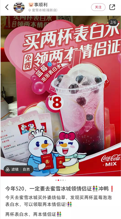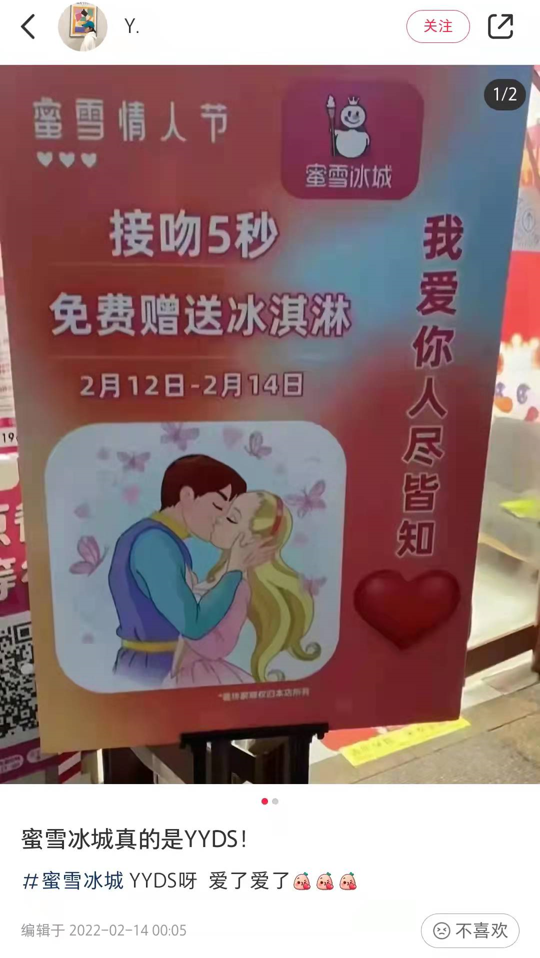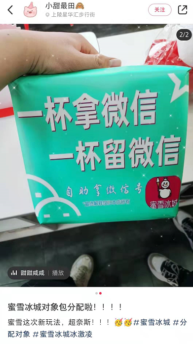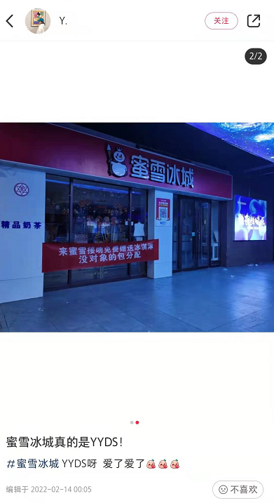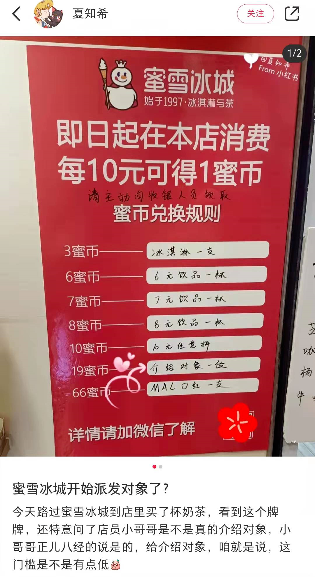 也不止这家店的活动,再仔细一扒才发现,蜜雪冰城门店今年情人节就有类似的活动了——众所周知,每年情人节总有些品牌,设一些让人在公共场所社死的活动。也许是秉承着“甜蜜蜜”的原则,蜜雪冰城在今年情人节依旧沿袭了之前七夕的接吻送冰淇淋的活动。不过从另一位博主的分享里可以看到有一个“自助拿微信的盒子”。从而打造一个——以蜜雪冰城为社交纽带的蜜雪冰城复古式交友新平台?在情人节,蜜友们(喝蜜雪冰城的朋友们)虽然没有对象可以接吻,但却可以分享或者抽取一个别人分享的微信联系方式。不得不说,虽然活动不大,也算是拿捏了大家脱单交友的心态,真会啊。