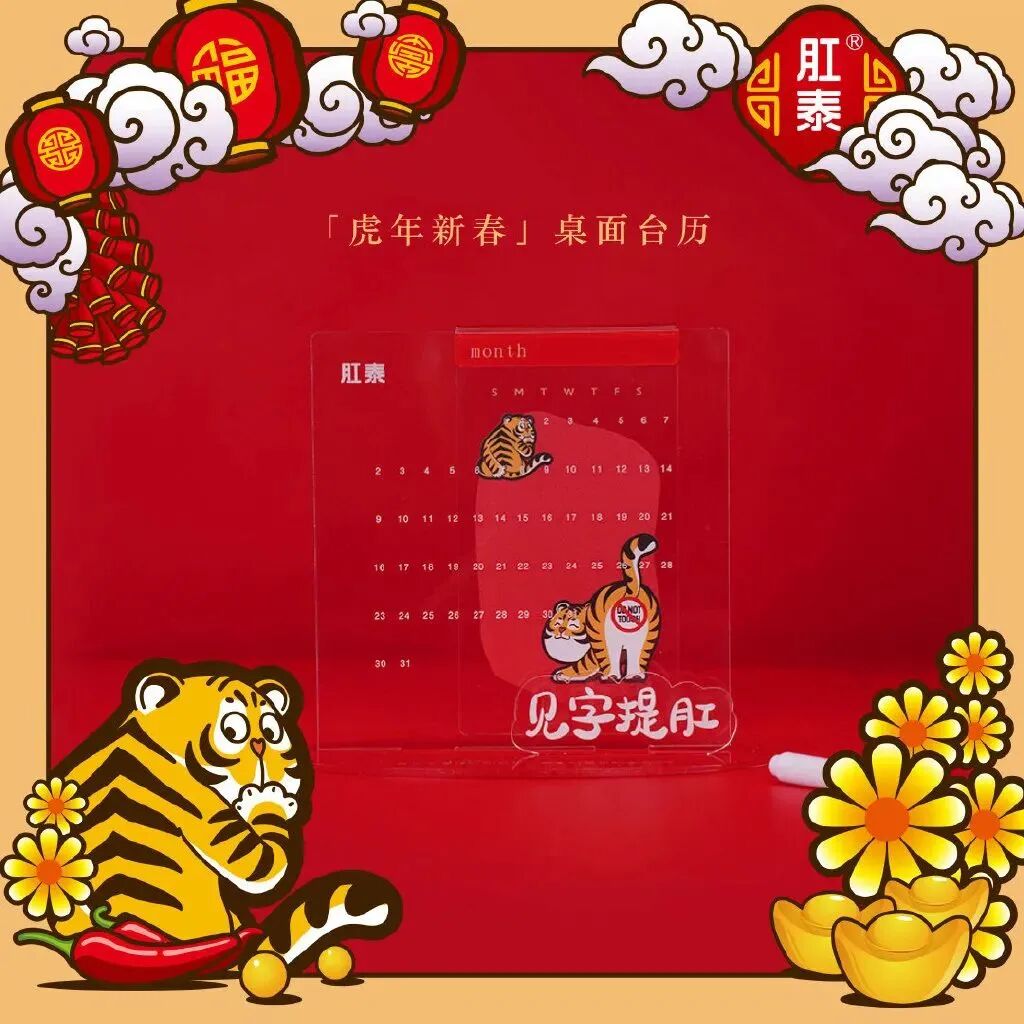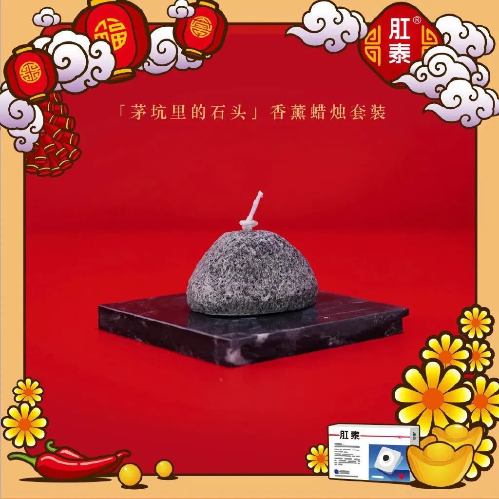 礼盒表面喜庆的包装配合老虎的设计,看起来非常正常,但仔细看每样物品的设计,就会发现不太对劲了。日历是新年礼盒常有的物品,一款透明精致的桌面台历也是很不错的想法,但当你看着翘屁股的老虎,并配上“见字提肛”,是不是突然觉得屁股有点坐不住了?小字部分还写有“每个不曾提肛的日子,都是对菊花的辜负”。配合土味沙雕文学的温馨提示,狂人感受到了品牌对用户的温暖,随后骂骂咧咧的将台历放进了抽屉里。此外还有这款“茅坑里的石头”,极具艺术感的设计,想必隔着屏幕都能感受到味道了吧?实际上,这是一款香薰蜡烛,放在厕所里也是非常的应景。此外还有教你练习提肛的翻页动画笔记本、一本正经祝你“顺畅”的老虎门神贴纸,可爱的老虎尾巴内裤、老虎防滑地垫和肛泰贴,整体礼盒伴随着沙雕搞怪的路线又极具创意。而这样的画风已经持续四年了,每一年都让用户感受到了肛泰搞怪又有内涵的品牌形象。早两年的设计中不仅脑洞大开,也让消费者感受到了品牌的思维布局。2019年新春礼包的备选方案中,有5分钟不出厕所就上传丑照到所有社交媒体的如厕APP,为防止大家长时间蹲厕也是不遗余力了;还有360度观测菊花情况的自拍杆和装配肛泰栓的子弹内裤,全方面守护用户的“肛”健康。虽然备选方案没有上线,但这样的创意思想显然体现到之后的每一次礼盒上。品牌自嘲的“缺德”上线事实上包含了品牌的满满的暖意,这样的思想布局是为了打开大众偏隐私的健康话题匣子,是让用户更容易接受并关注到“肛”健康的大胆举动。