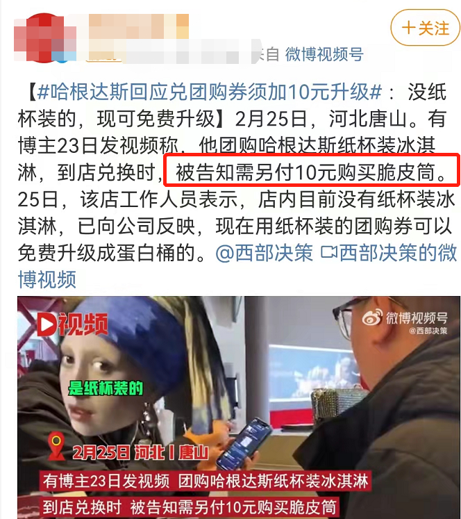 可没想到距离这天还有半个月的时间,有的品牌已经迫不及待插队来赶场,上演自杀式公关。前两天他去哈根达斯(唐山万达广场店),想要兑换团购的纸杯装冰淇淋,店员却要求加价10元买个筒。也就是说,“纸杯装冰淇淋”6个字,哈根达斯只能满足你后三个字,“纸杯装”只是装的?挂网上明码标价卖,到门店又不让买,以为你是闲鱼的弟弟“闲着吗”带上家里的锅碗瓢盆,再练成金刚不坏之手,绝对自给自足这位抖音博主团购的是双球外带冰淇淋券,原价是65元,团购价48.8元。商家打七五折,不给堂食能理解。价格已经让步了,座位就不让坐了。但这不是问题,问题在于商家把博主耍得团团转,潜规则的套路一个接着一个。券是冰淇淋纸杯装的,但是店里却不卖纸杯装的,总之有货没货我说了算,一副“我就喜欢看你想吃又吃不到的样子”的态度。像不像电视剧里,警察蜀黎去找大厦保安,问问能否调个监控看看。懂的都懂,保安总会献上一个万能文案模板:我们的监控坏了。