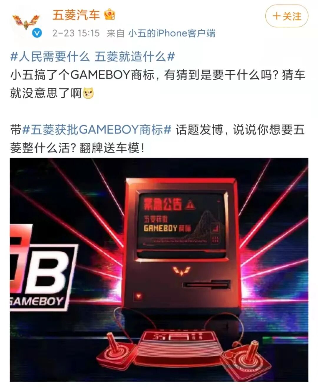而近日,五菱却突然宣布自己注册了“GAMEBOY”商标,还表示要“玩把大的”、“大家喜欢的,非常大的动作”……